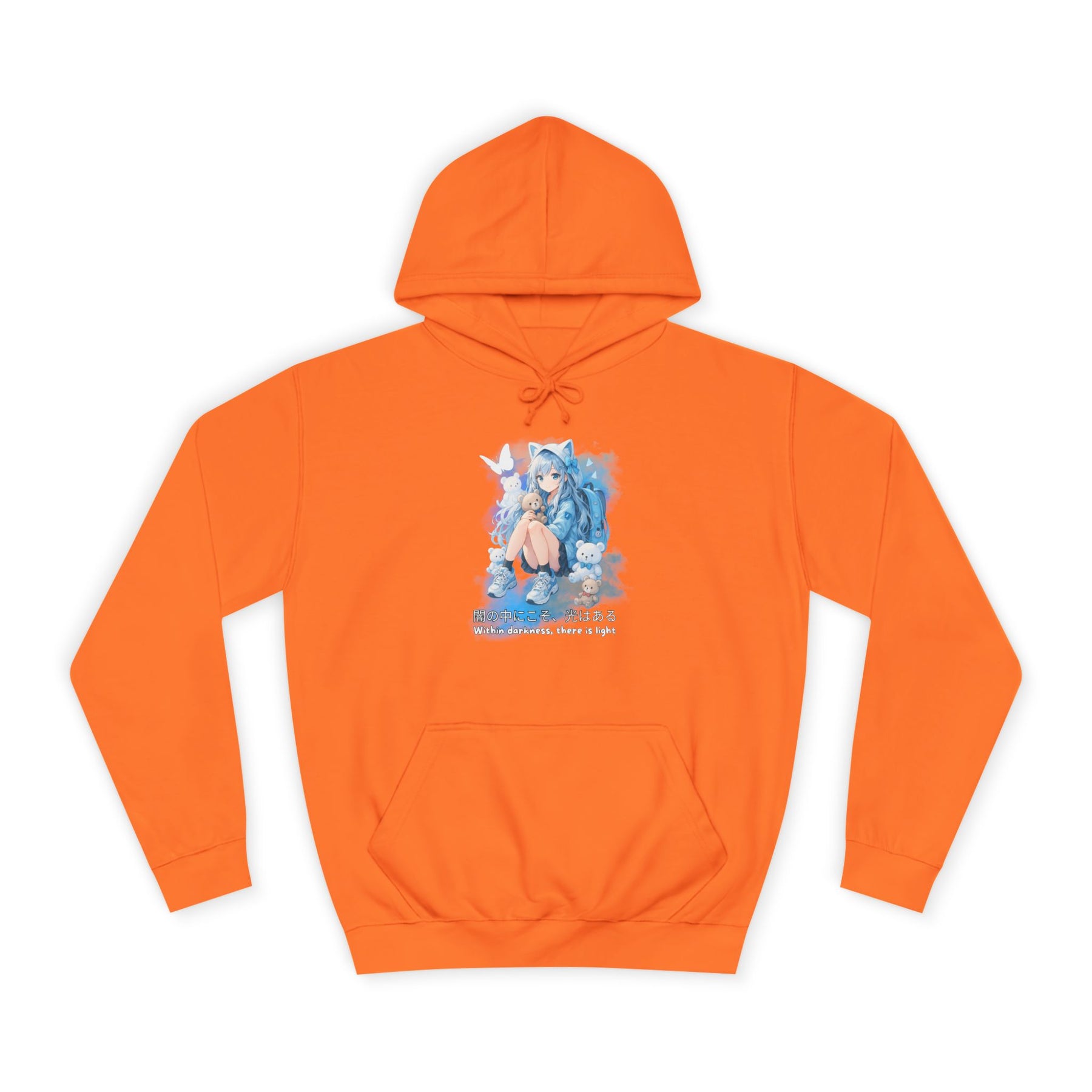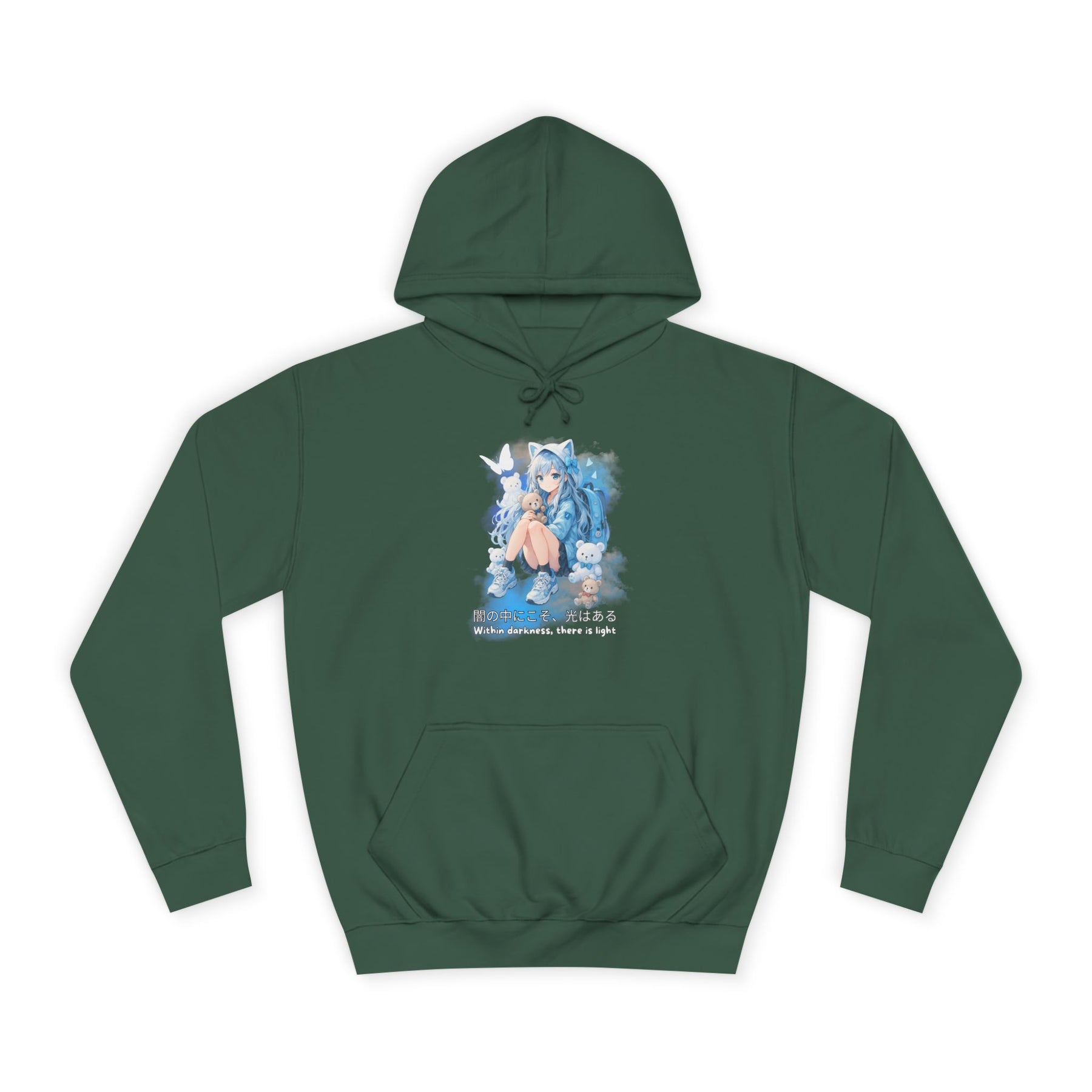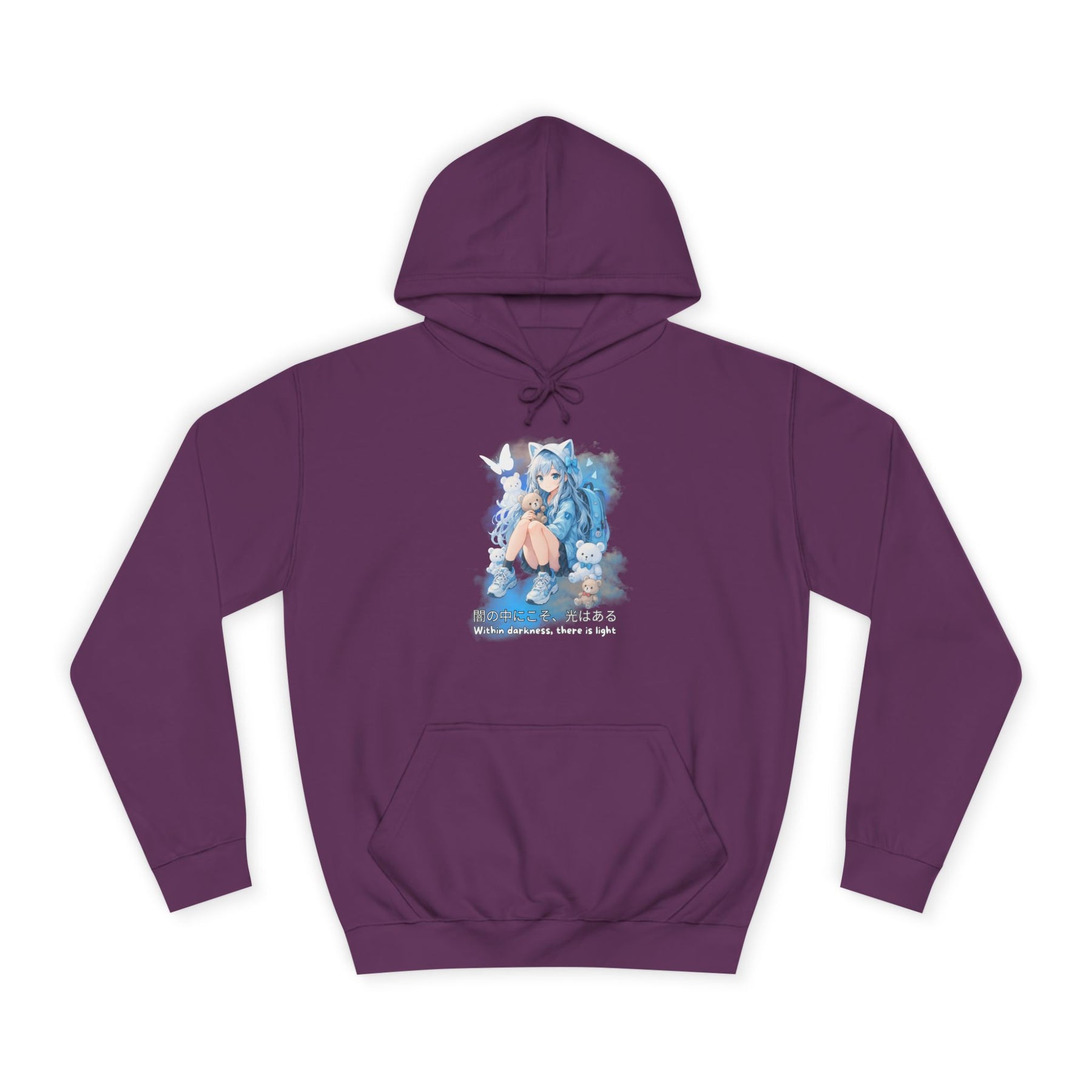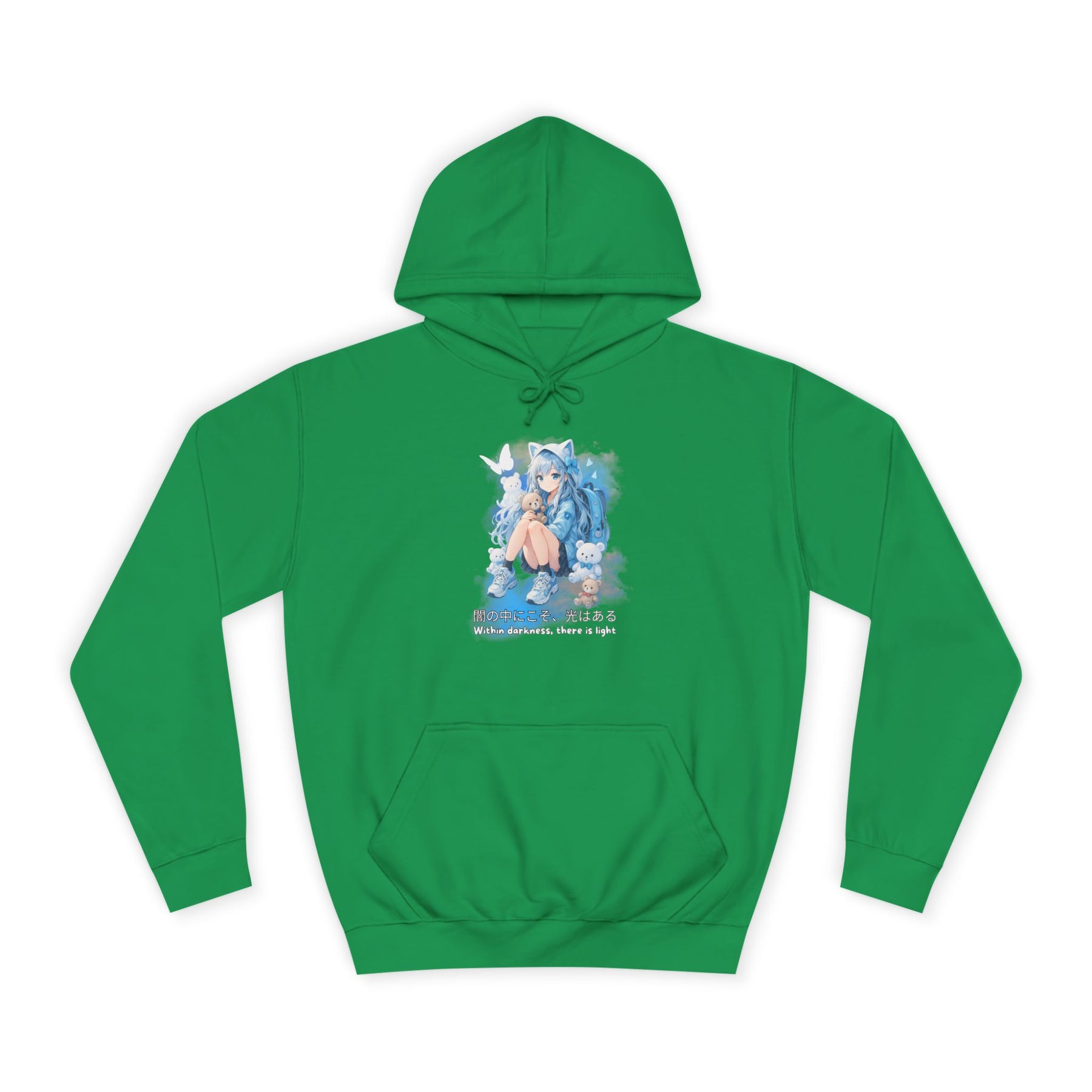 Dieser Hoodie zeigt eine zarte Anime-Figur mit leuchtend blauer Aura, flauschigen Begleitern und einer Message, die Hoffnung schenkt: