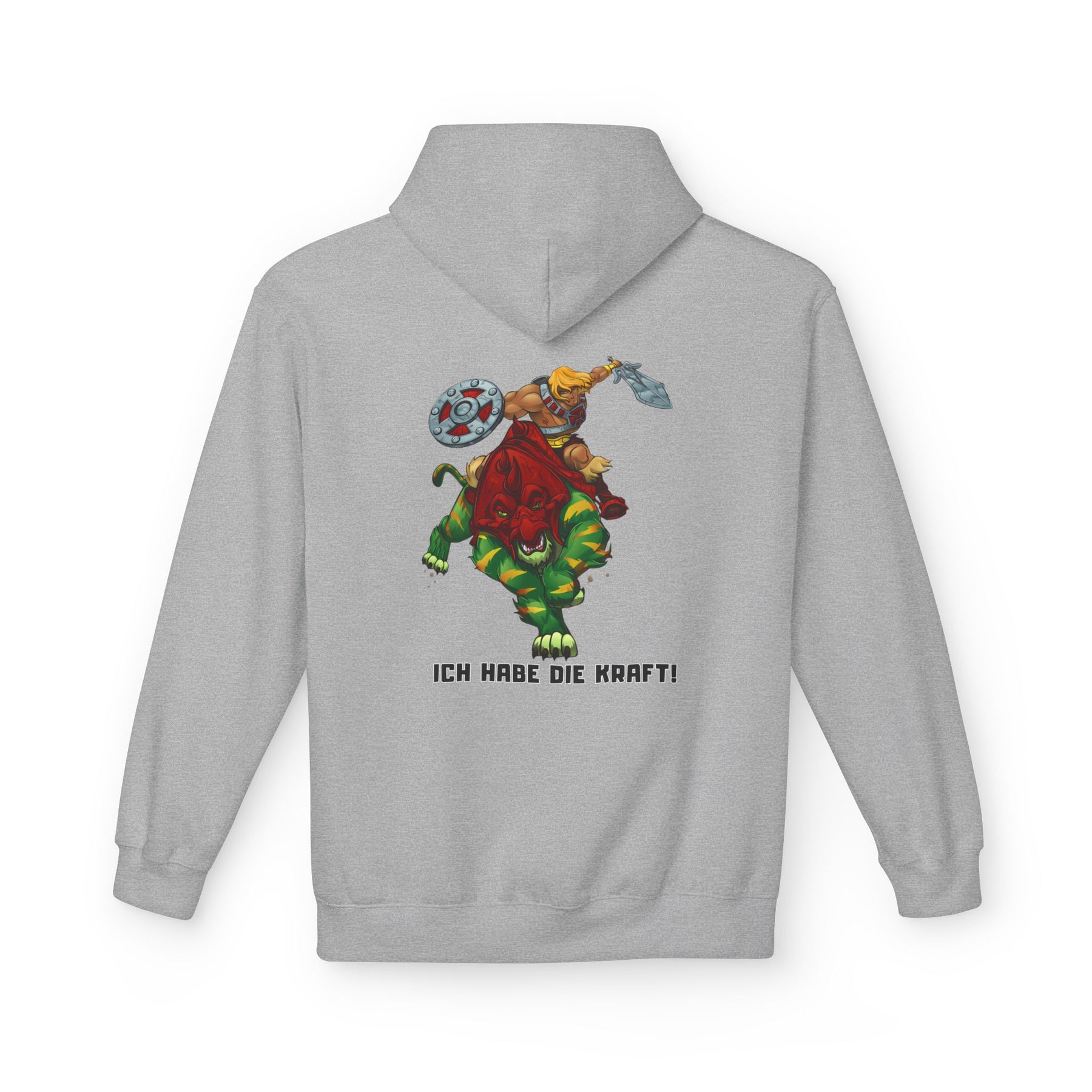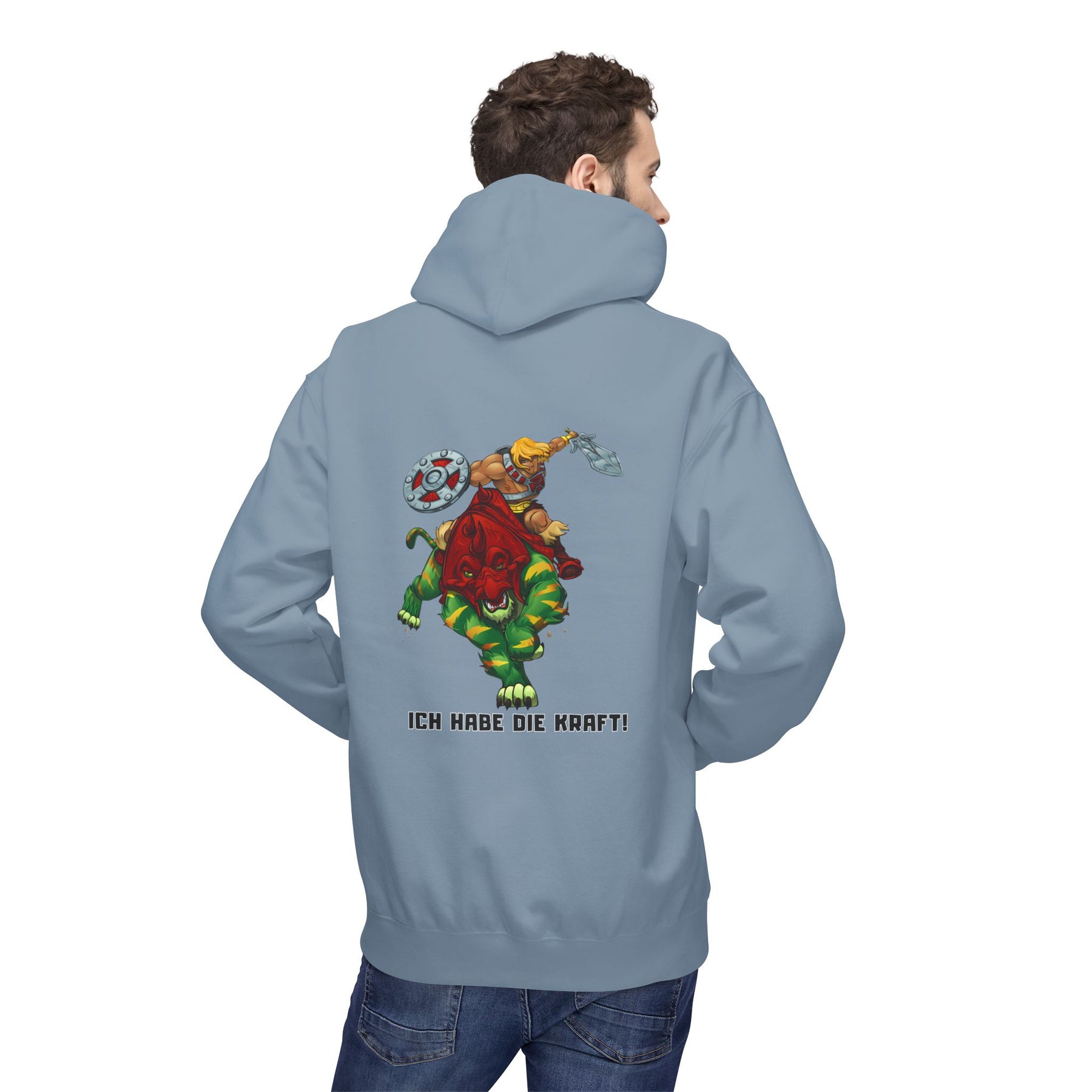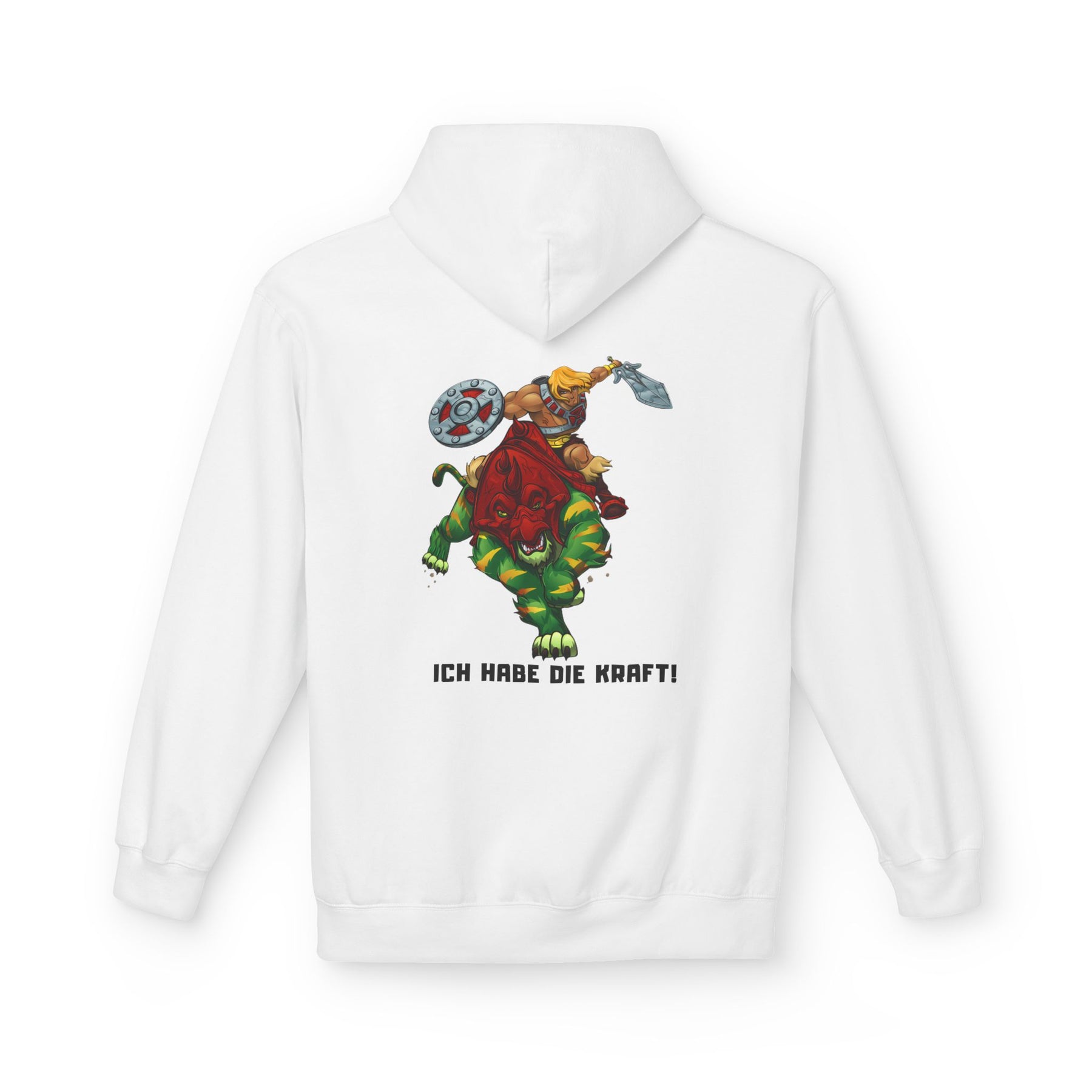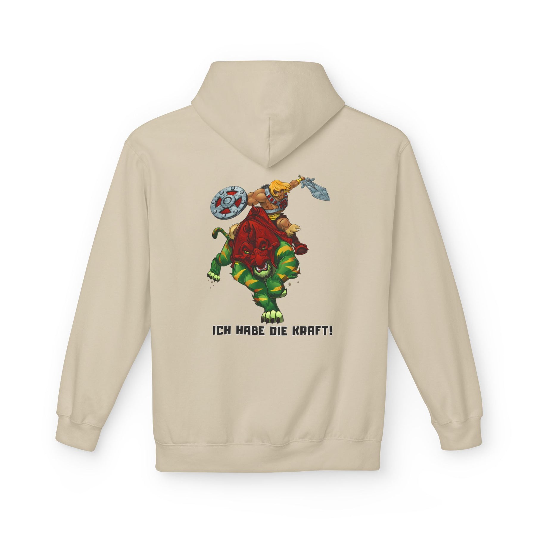 This hoodie is a bold statement for all fans of He-Man, Battle Cat, and retro action! Featuring the iconic "Masters of the Universe" logo on the front and a powerful back print with "Ich habe die Kraft!", it's perfect for those who love nostalgic vibes and heroic energy.