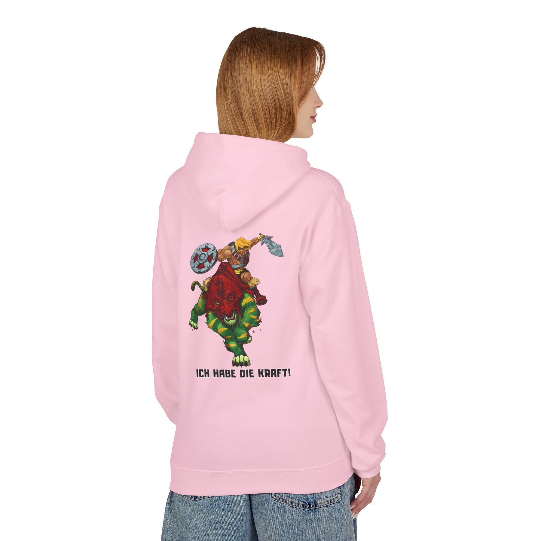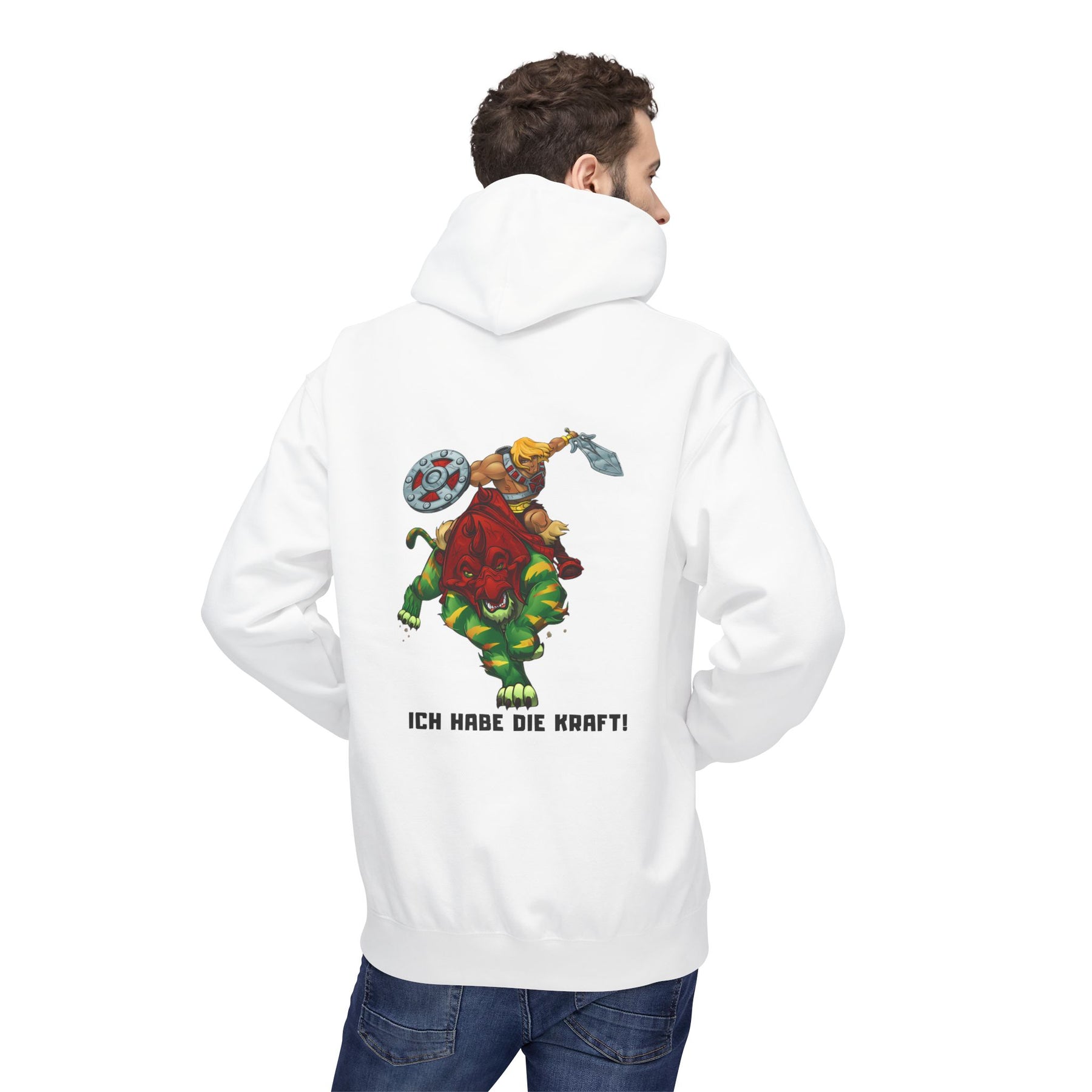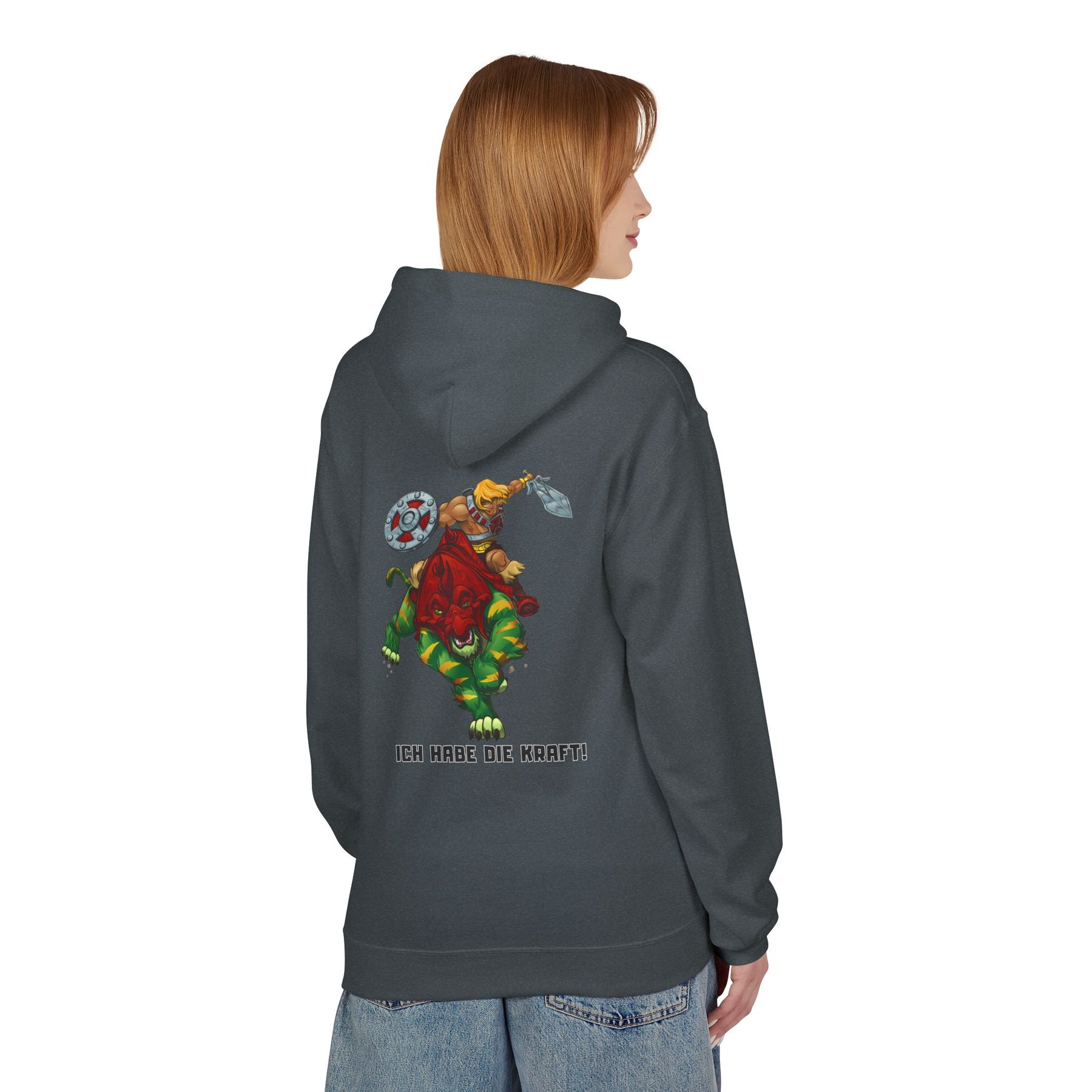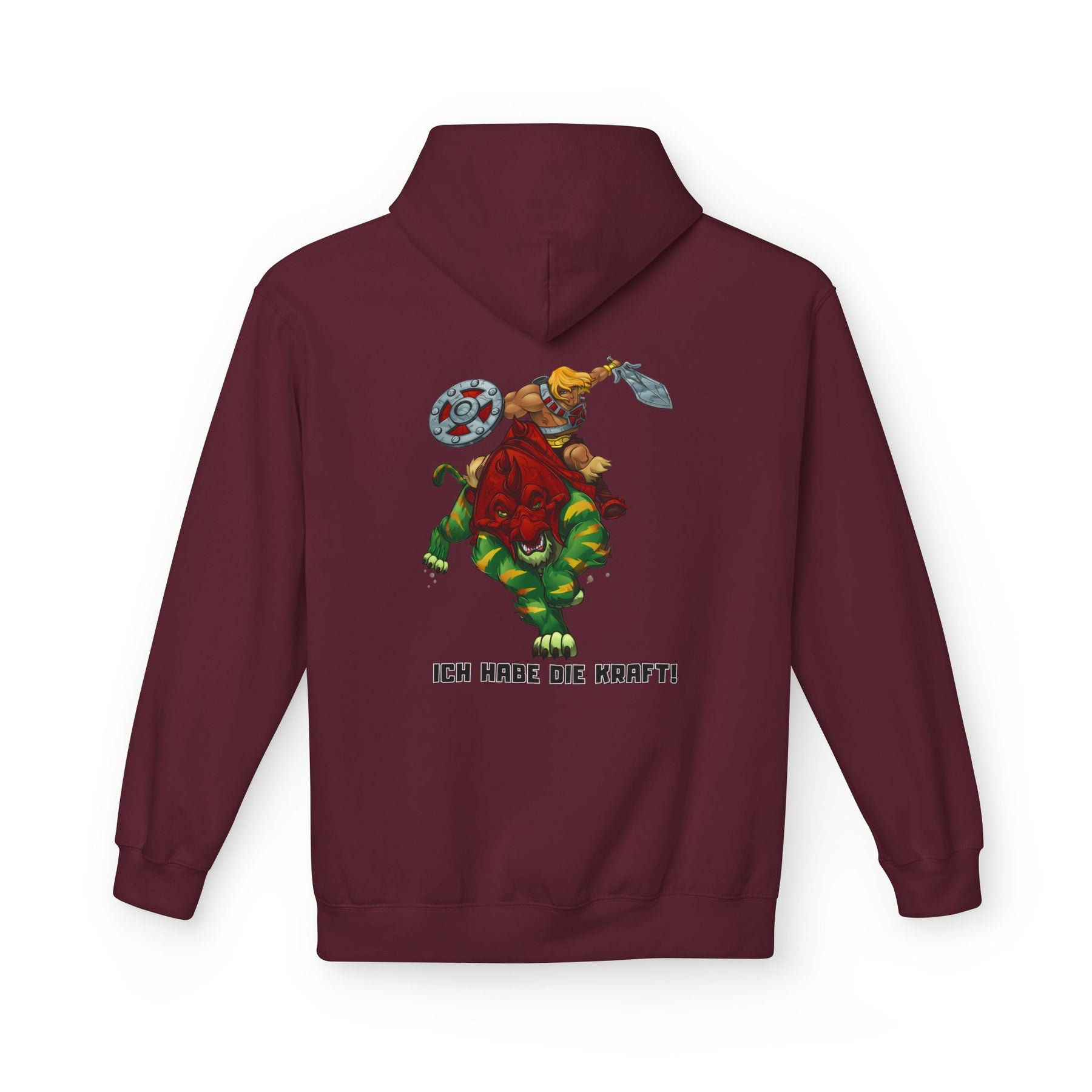 This hoodie is a bold statement for all fans of He-Man, Battle Cat, and retro action! Featuring the iconic "Masters of the Universe" logo on the front and a powerful back print with "Ich habe die Kraft!", it's perfect for those who love nostalgic vibes and heroic energy.