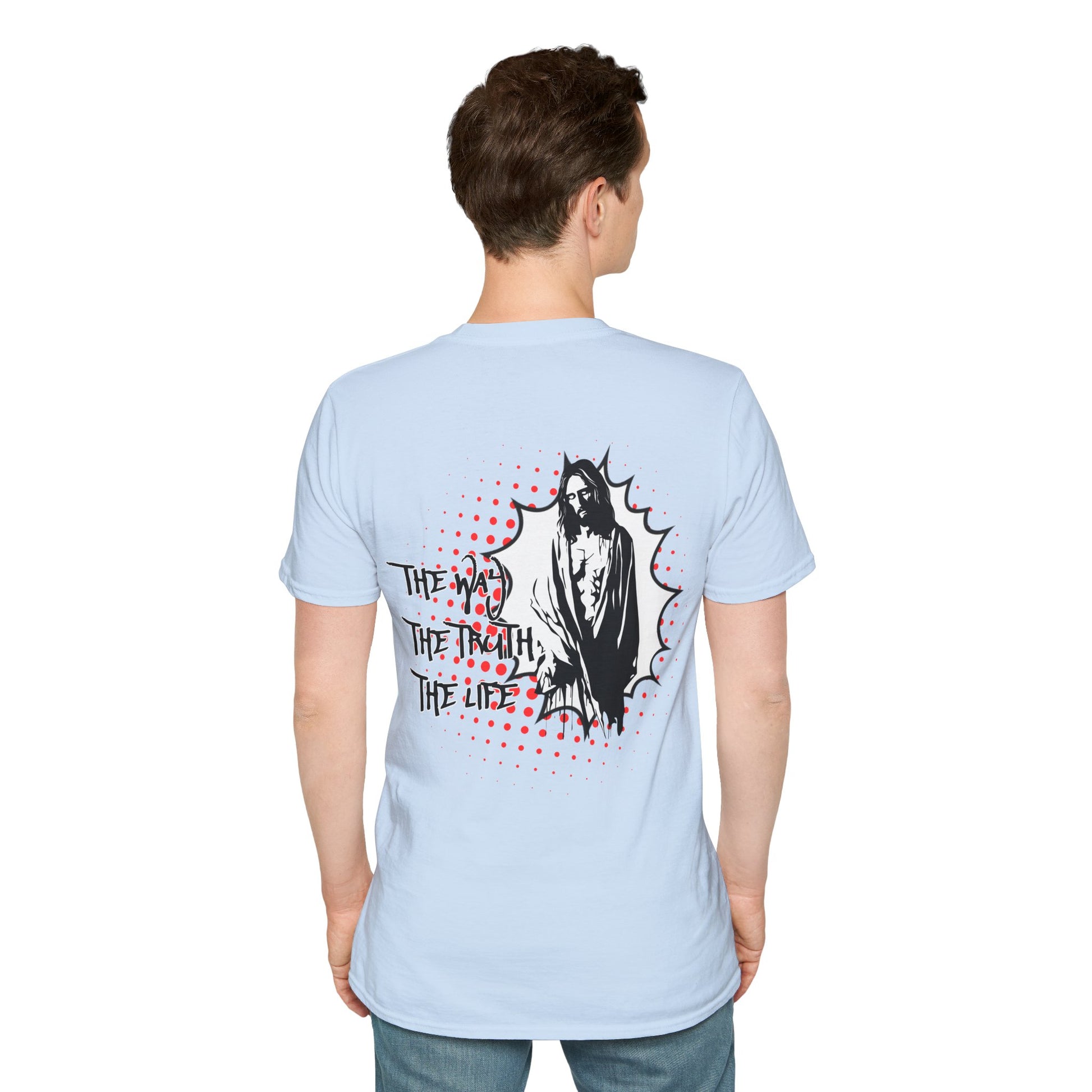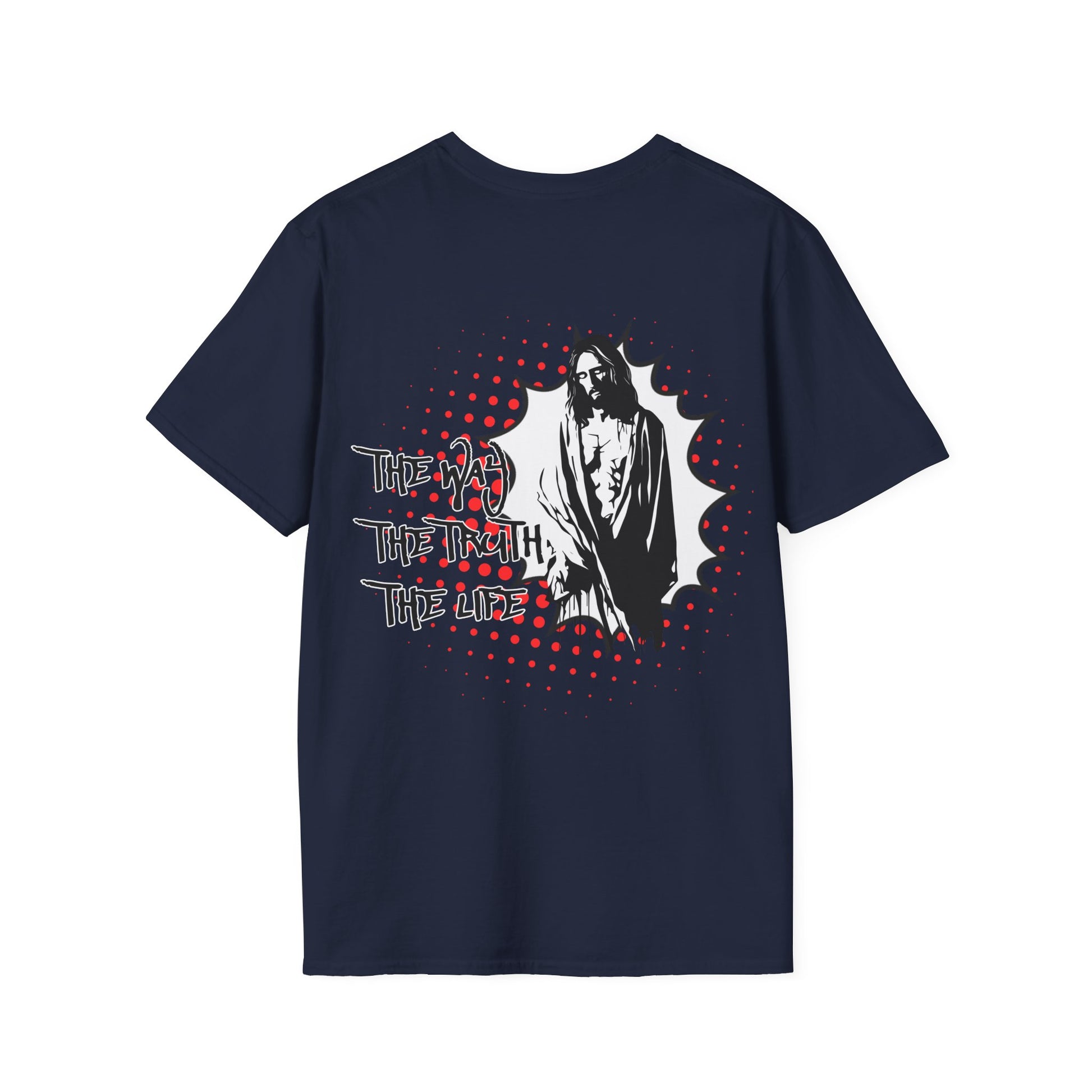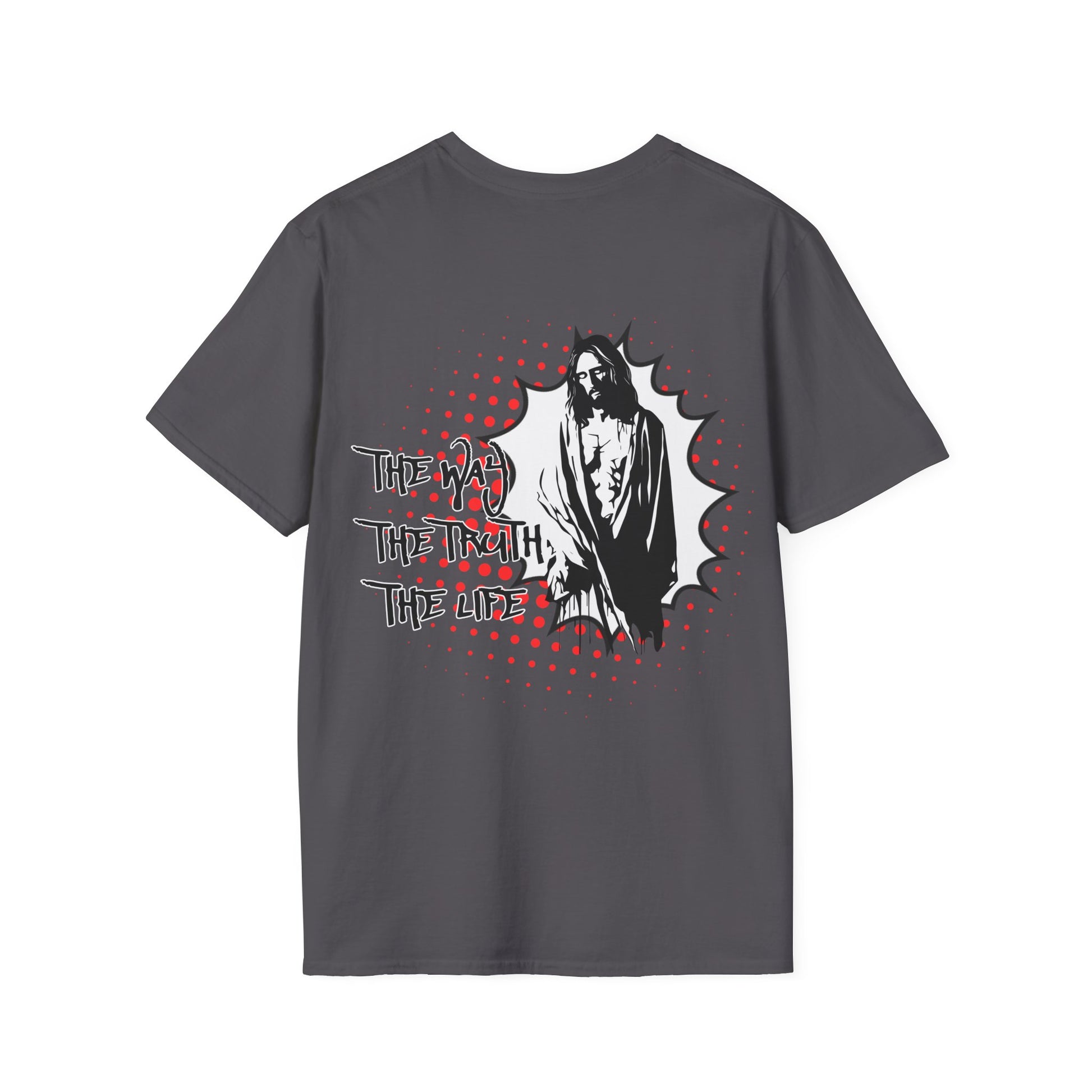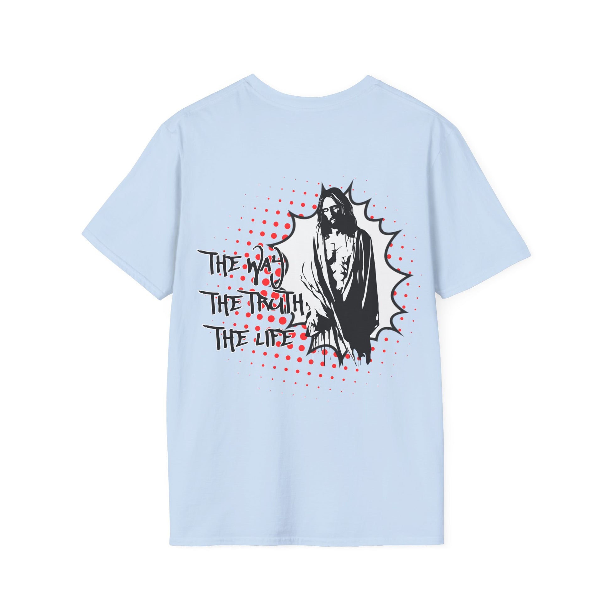 The design features Jesus with a crown of thorns in a modern streetwear style, combined with the message “The Way, The Truth, The Life”.