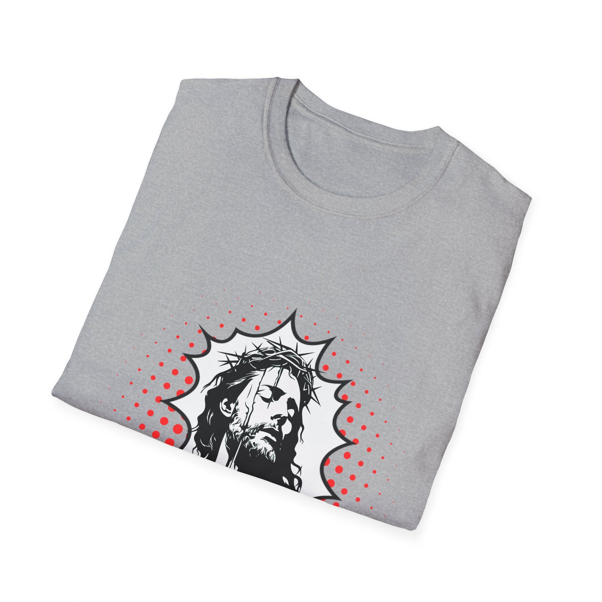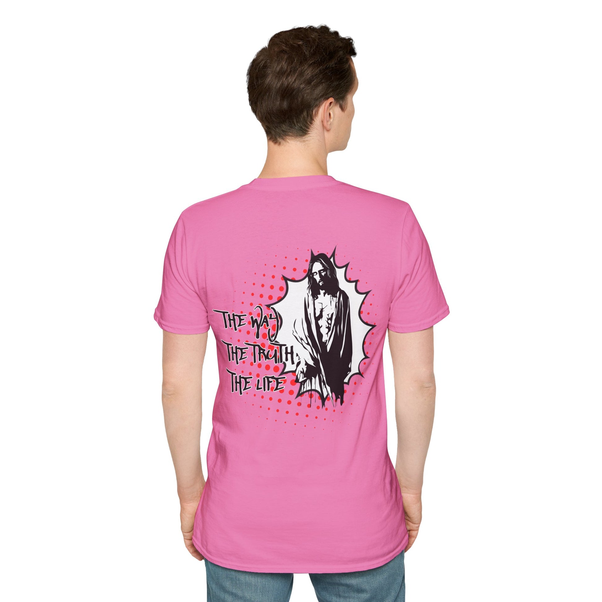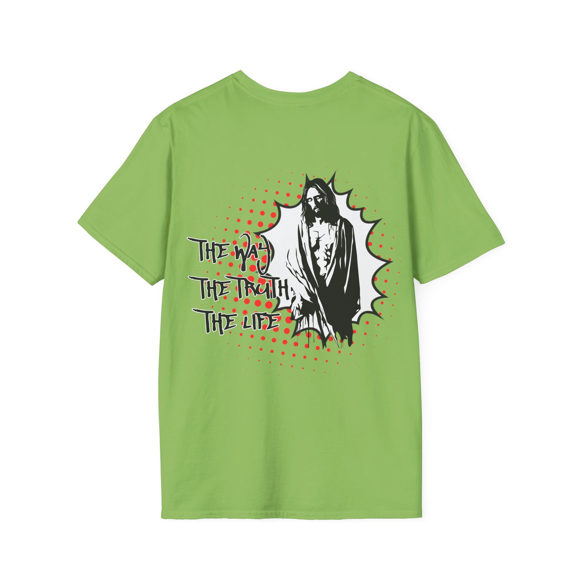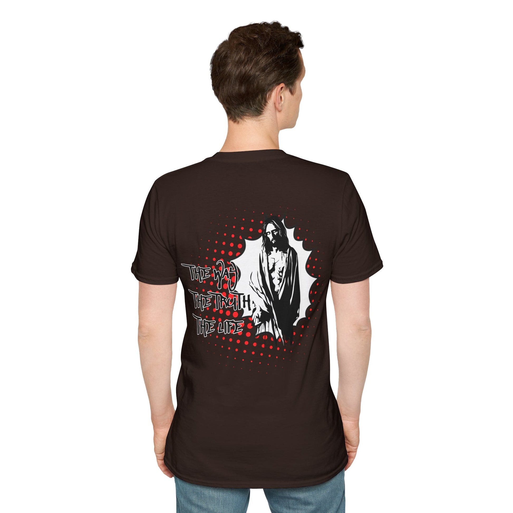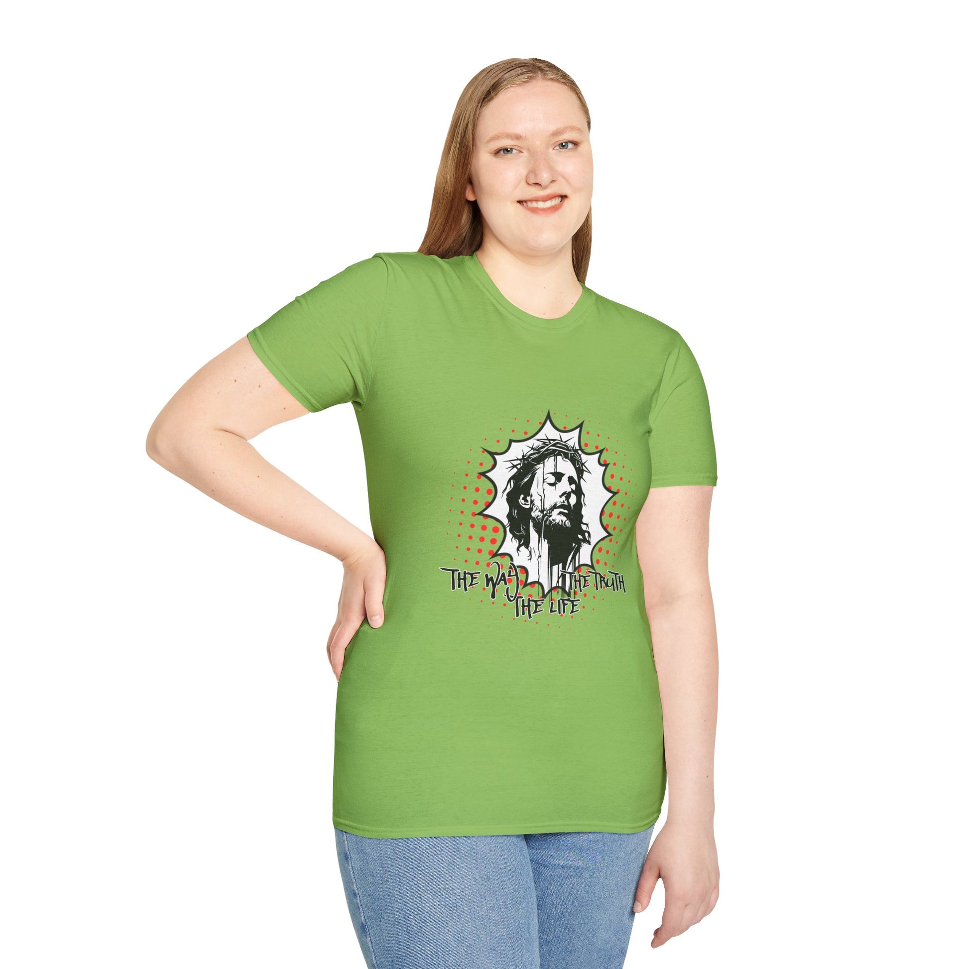 The design features Jesus with a crown of thorns in a modern streetwear style, combined with the message “The Way, The Truth, The Life”.