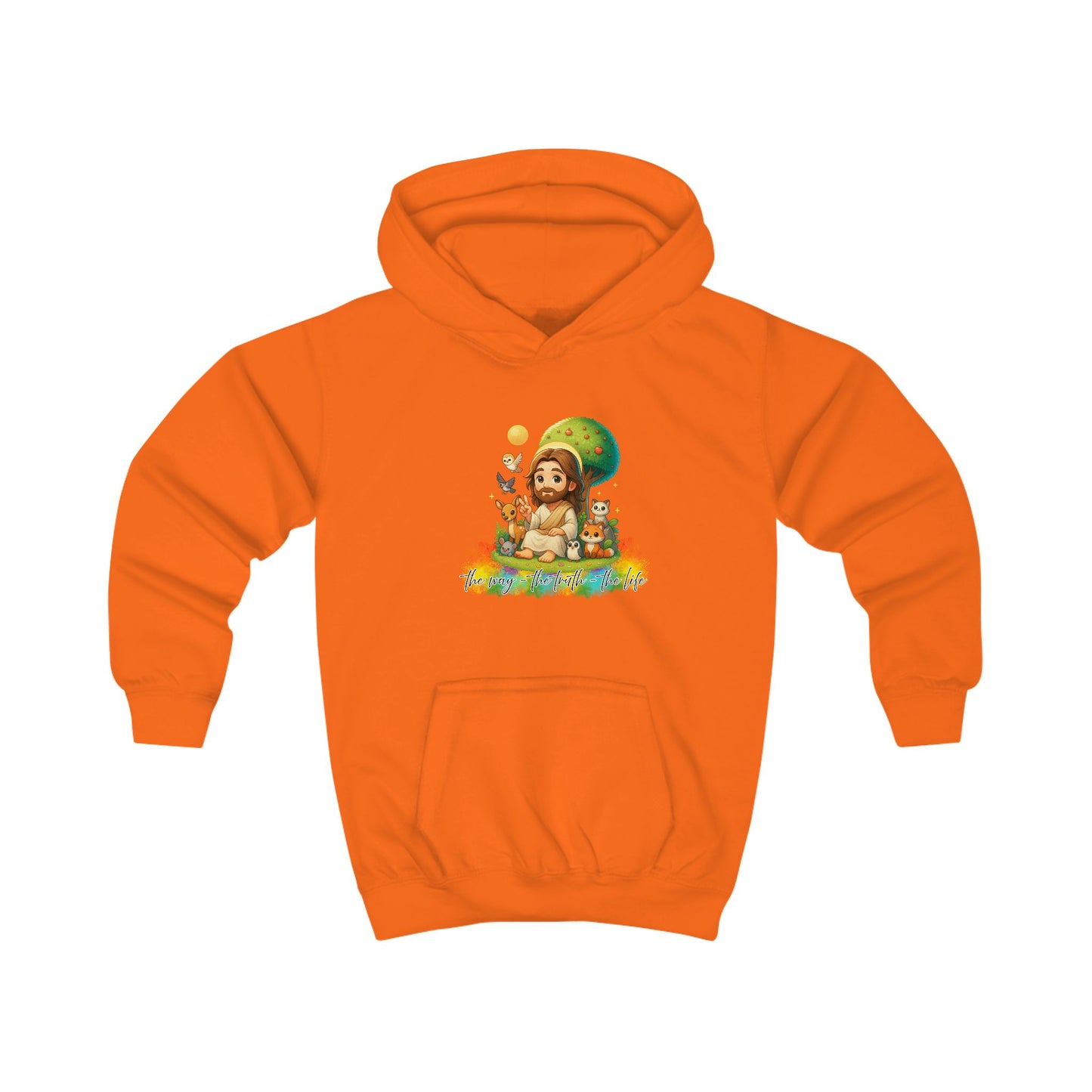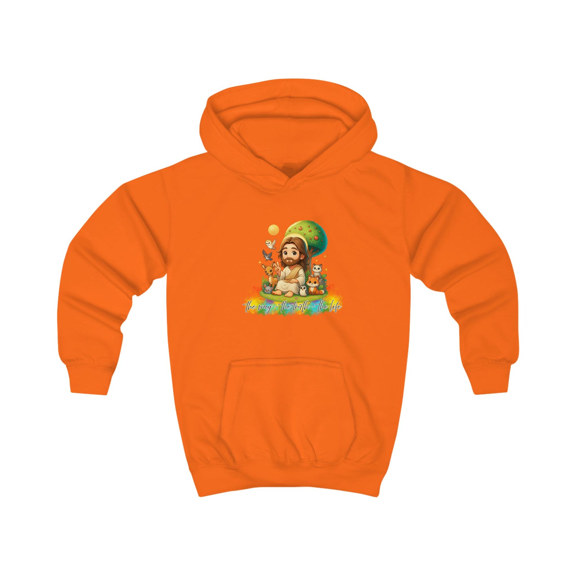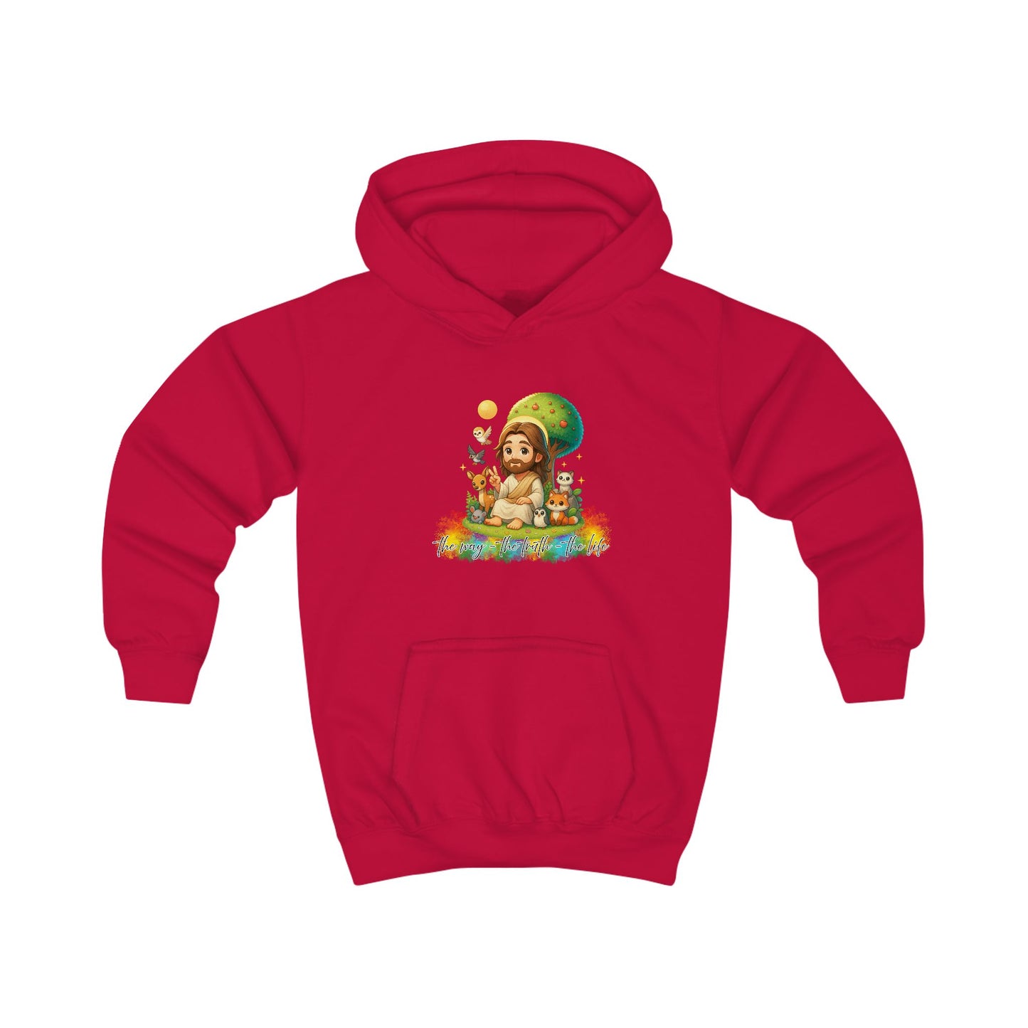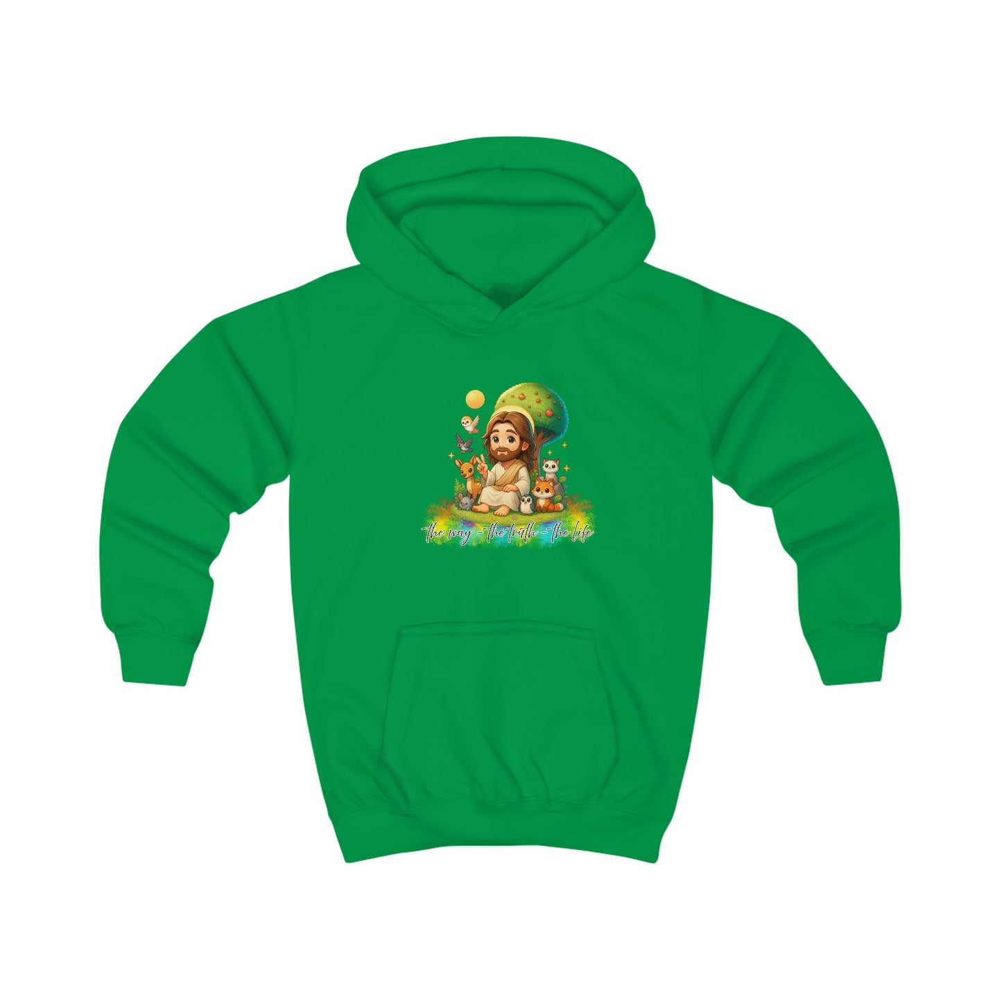 Dieses farbenfrohe Design zeigt Jesus in einer liebevollen Cartoon-Szene mit Tieren und der Botschaft „the way – the truth – the life“. Ein inspirierendes Motiv für alle, die ihren Glauben mit Freude, Frieden und Hoffnung ausdrücken möchten.