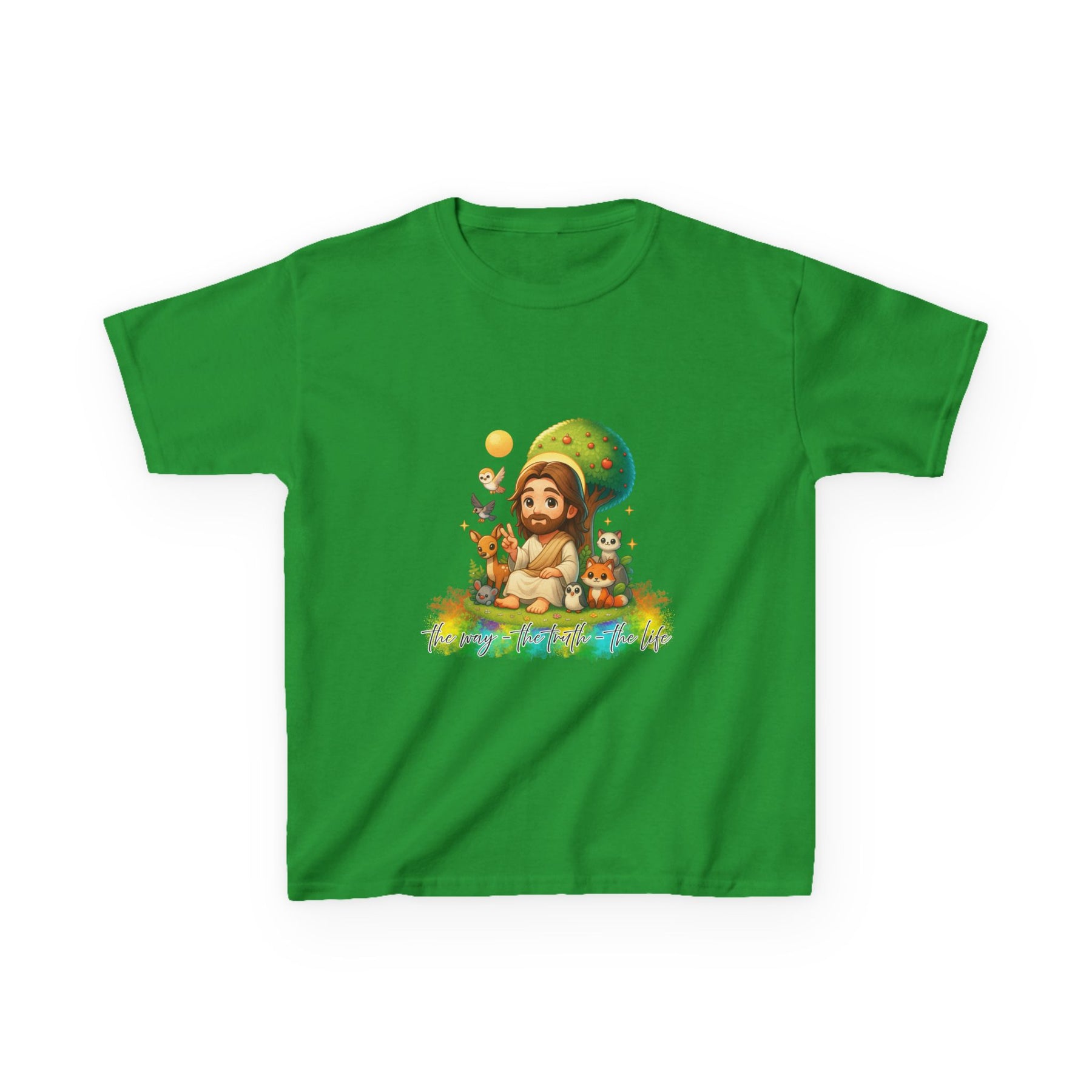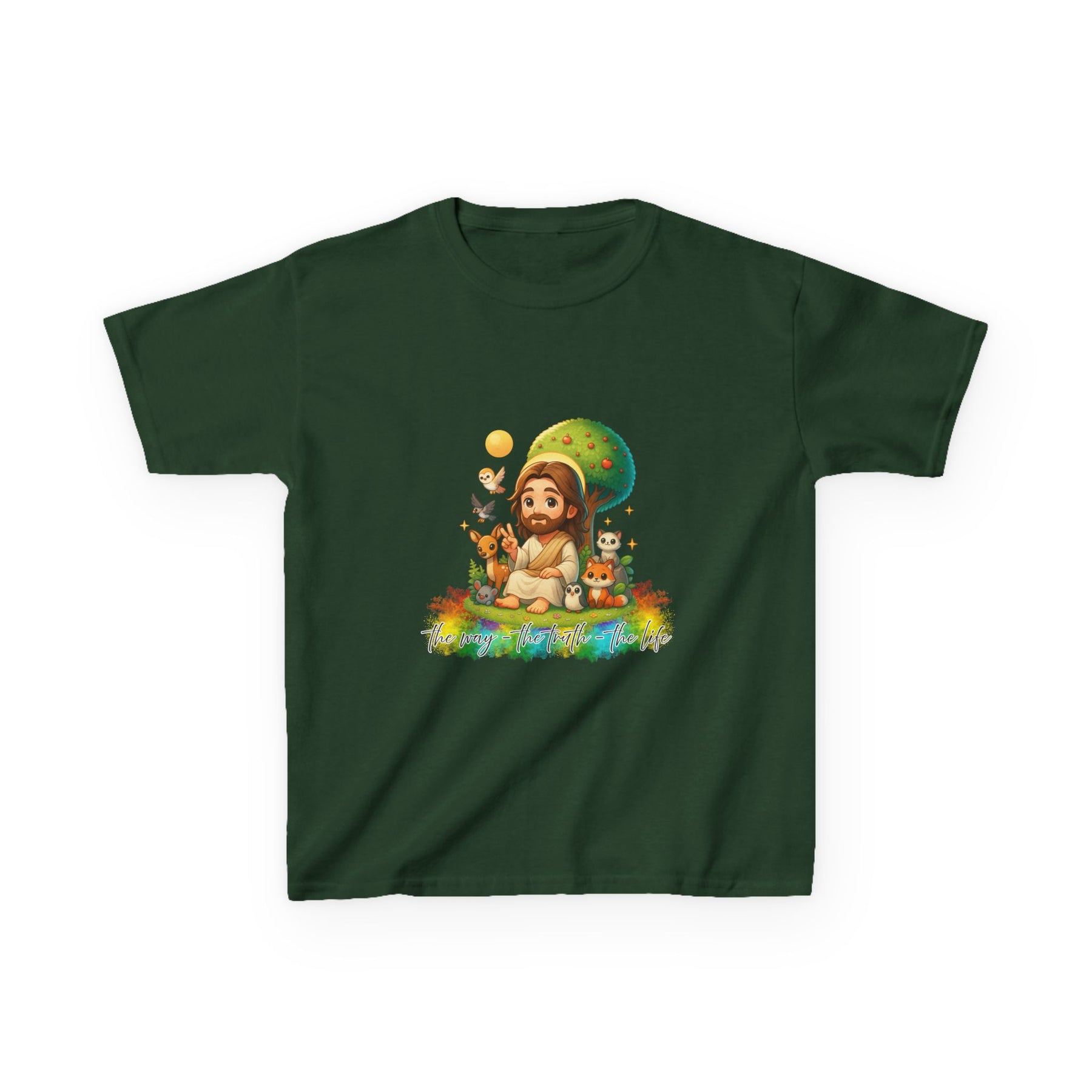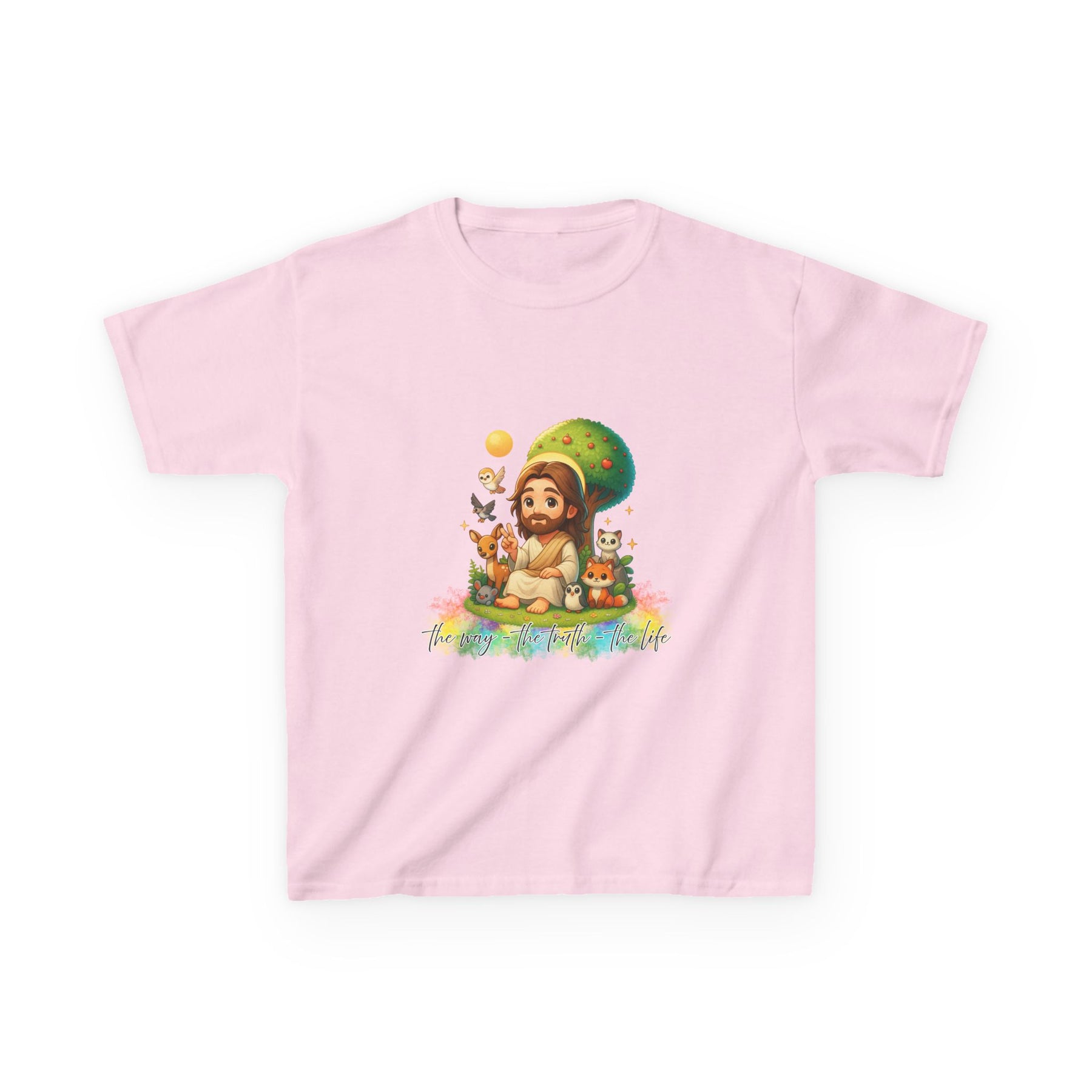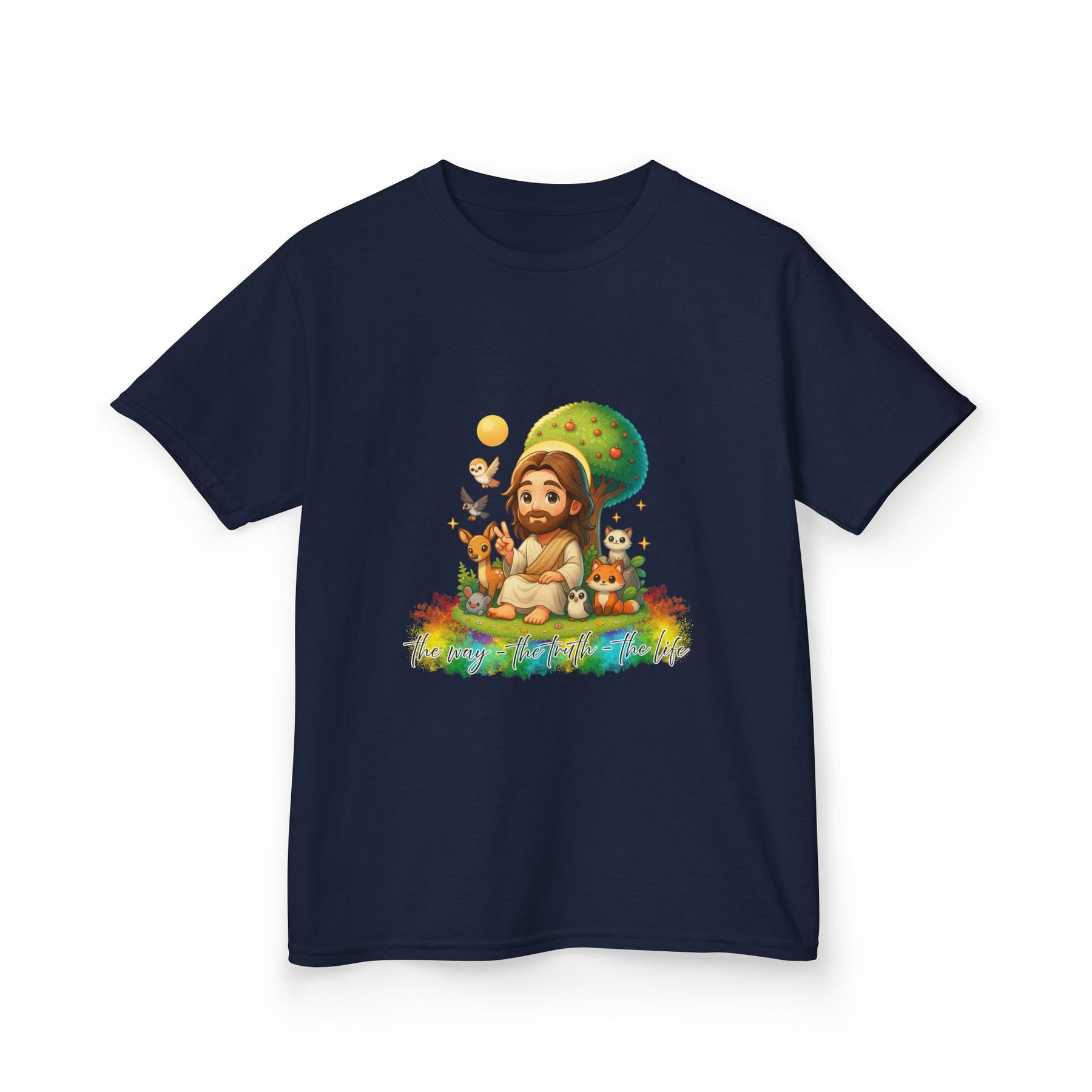 Dieses farbenfrohe Design zeigt Jesus in einer liebevollen Cartoon-Szene mit Tieren und der Botschaft „the way – the truth – the life“. Ein inspirierendes Motiv für alle, die ihren Glauben mit Freude, Frieden und Hoffnung ausdrücken möchten.
