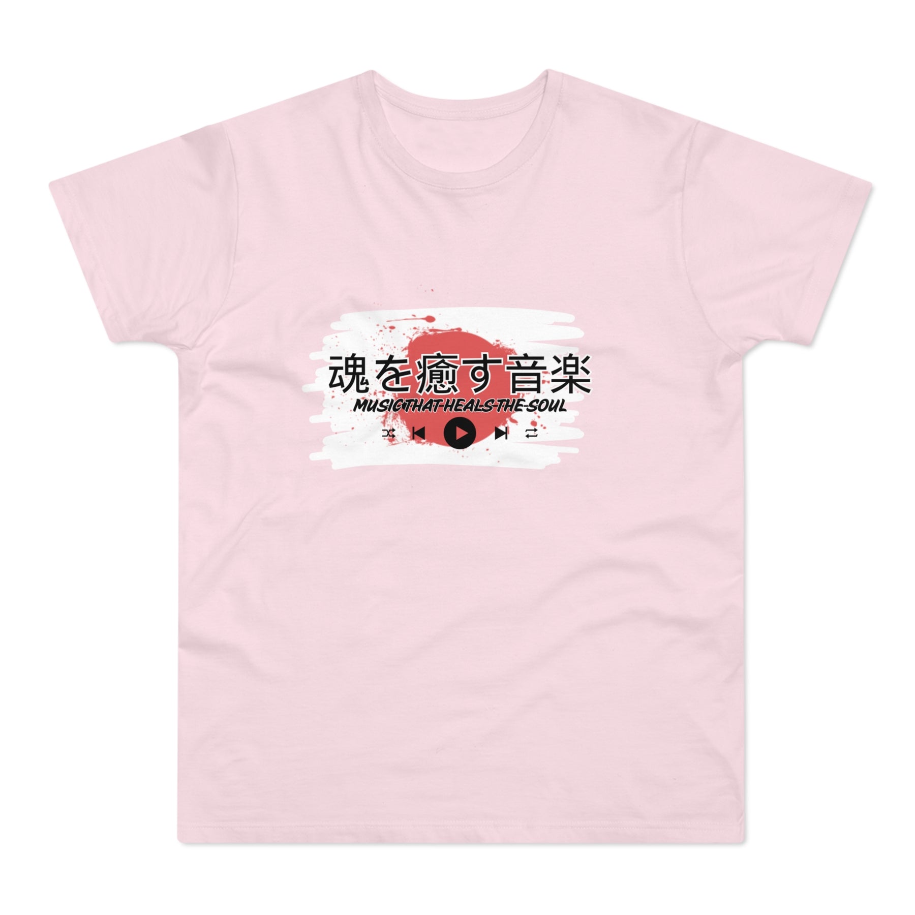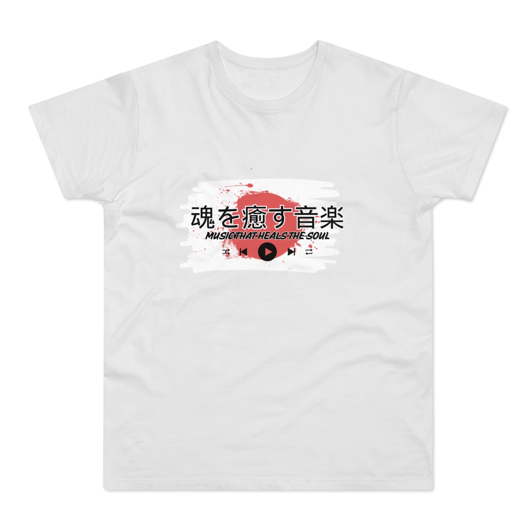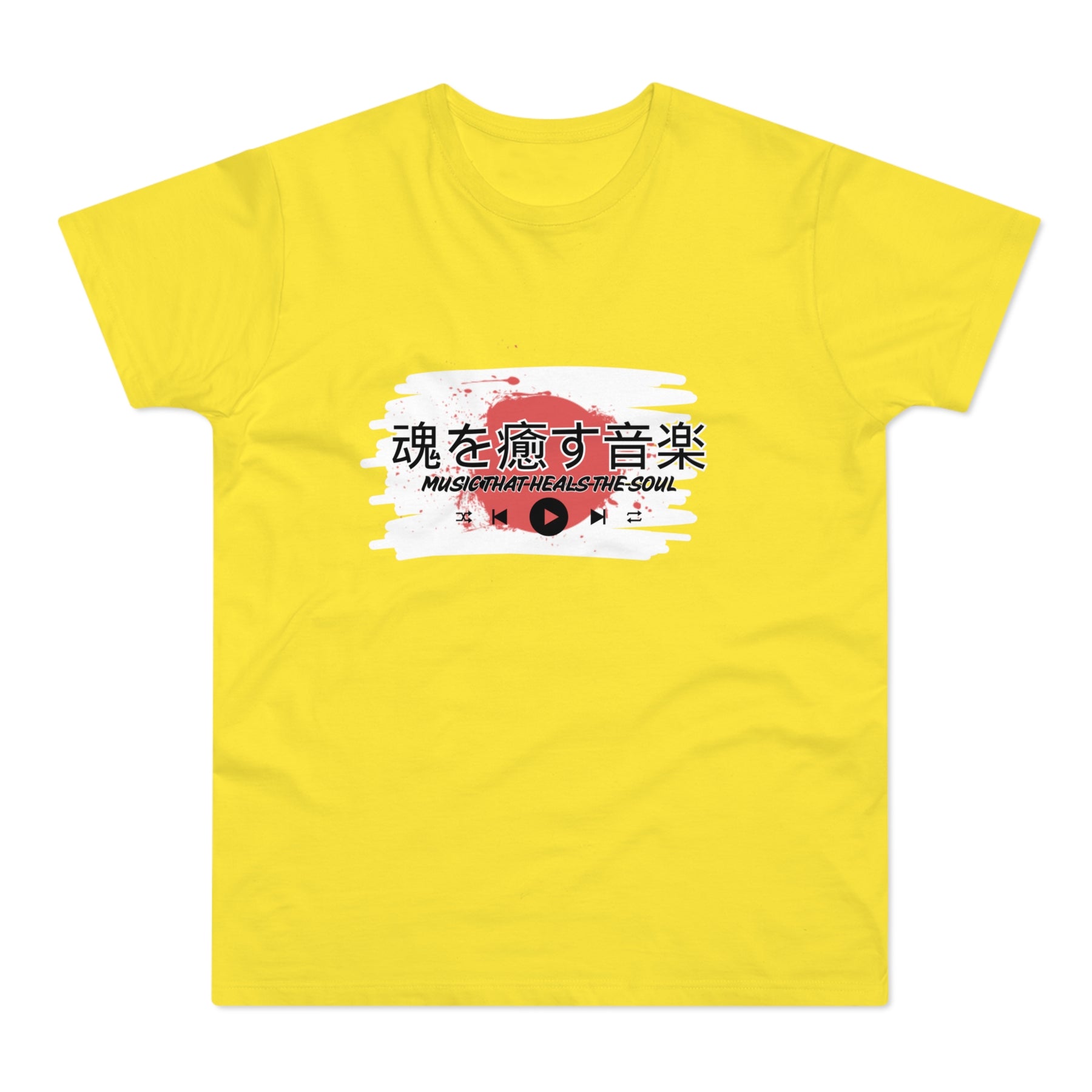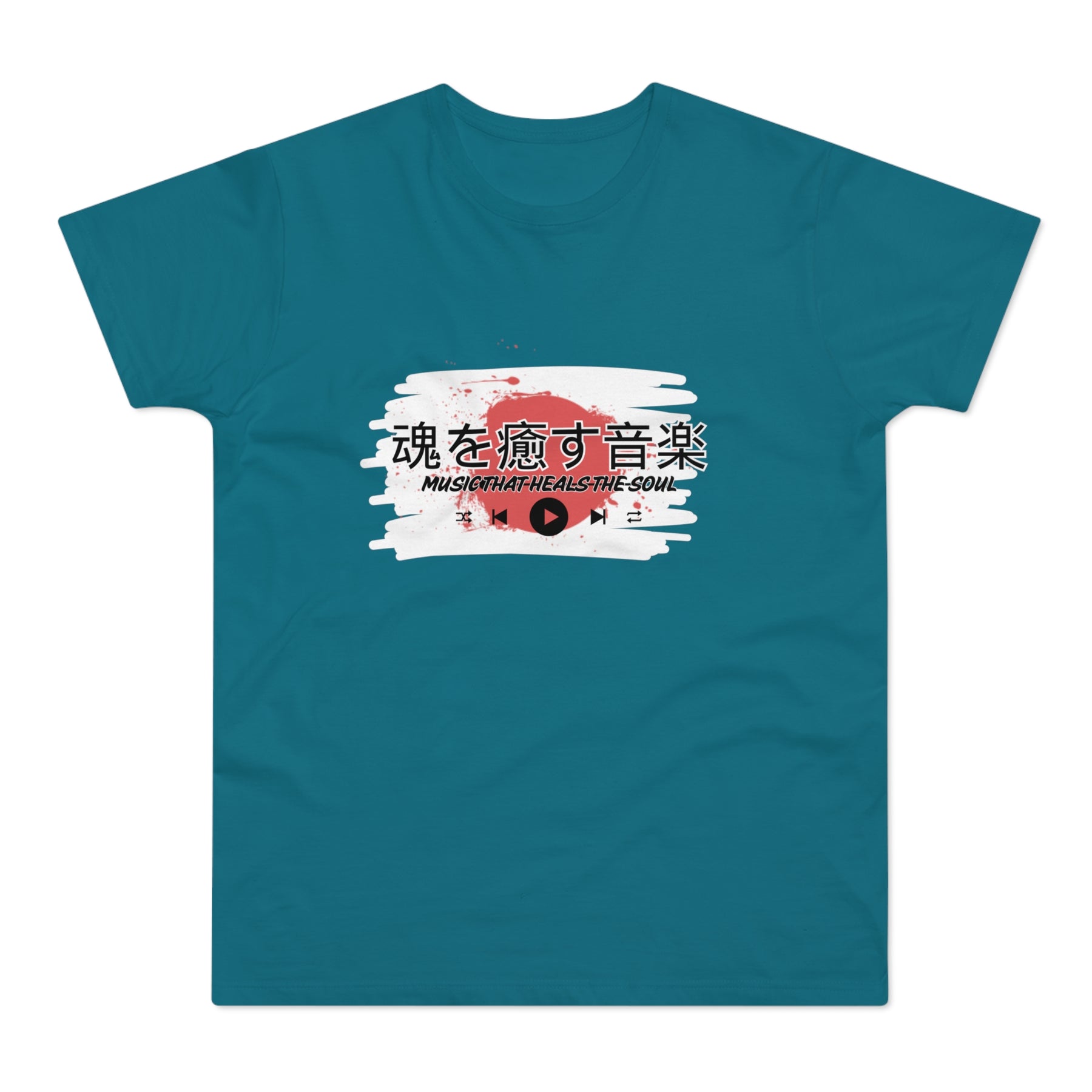 Design: Japanese characters with the English phrase "Music that heals the soul"