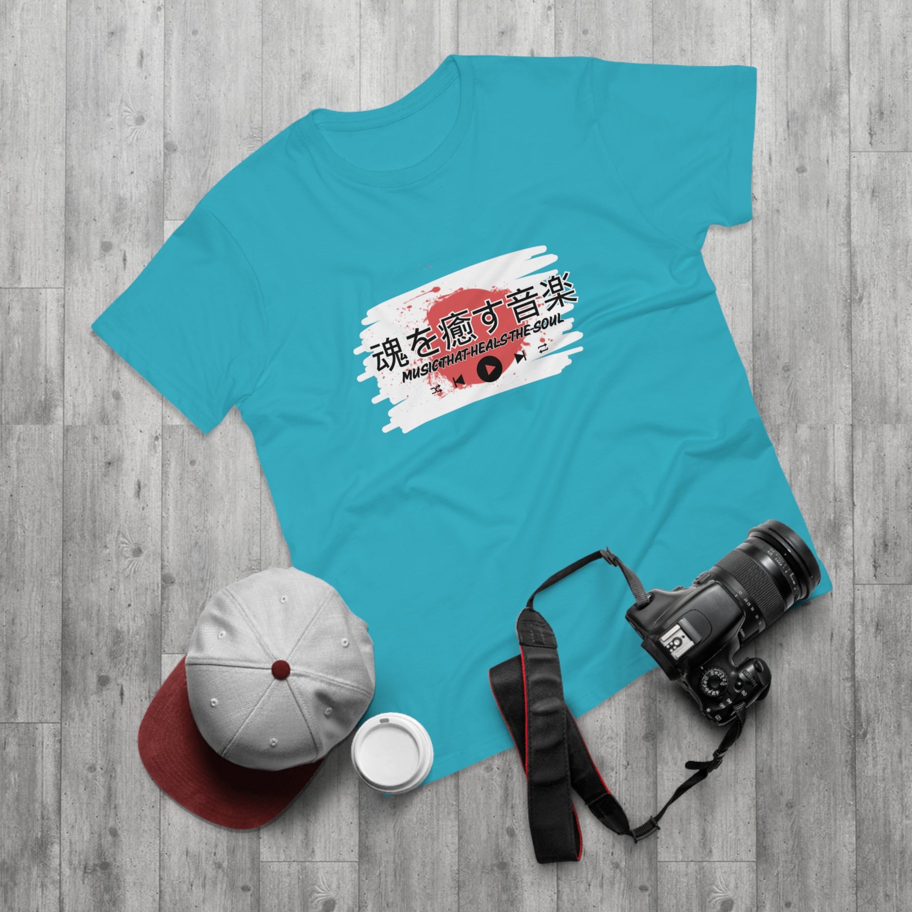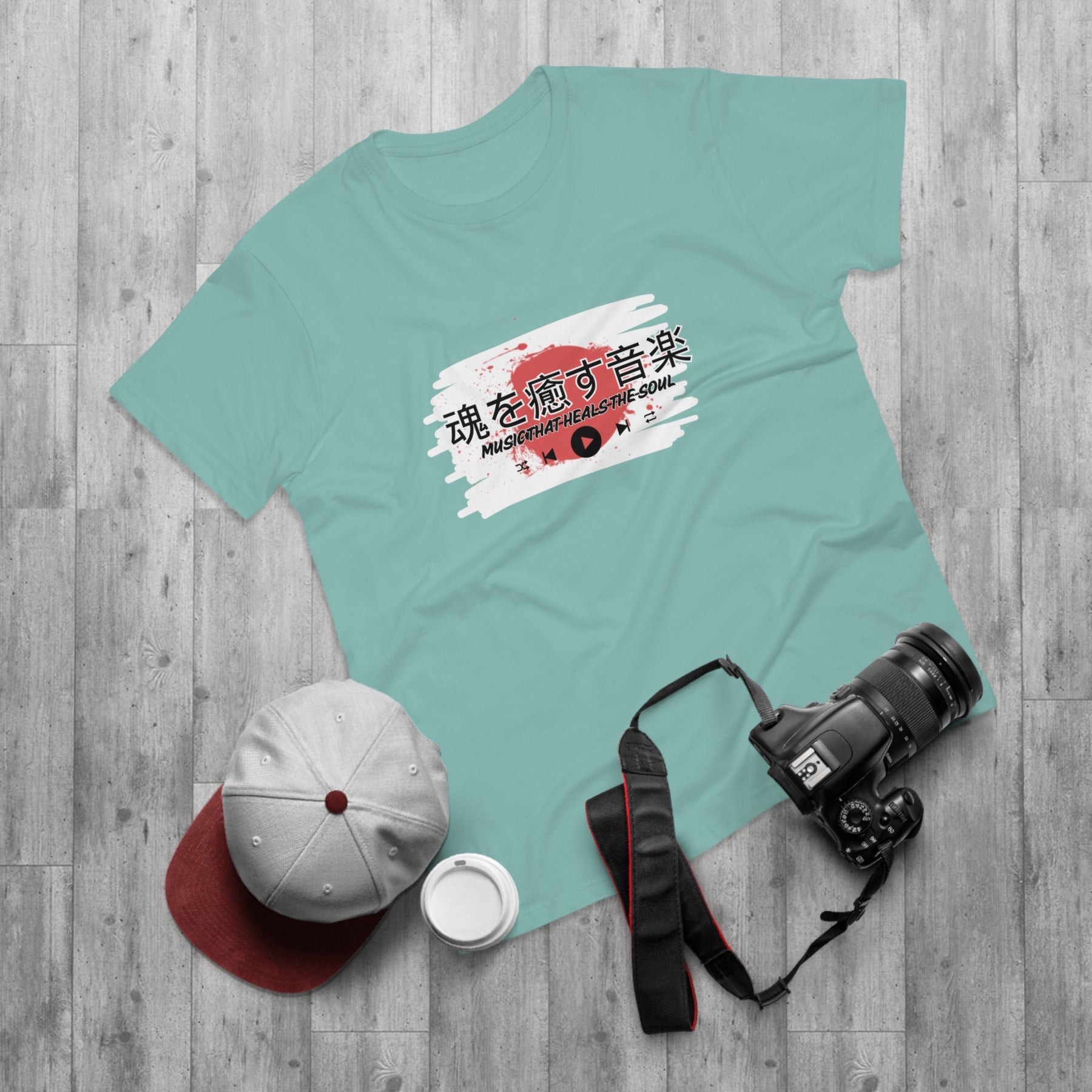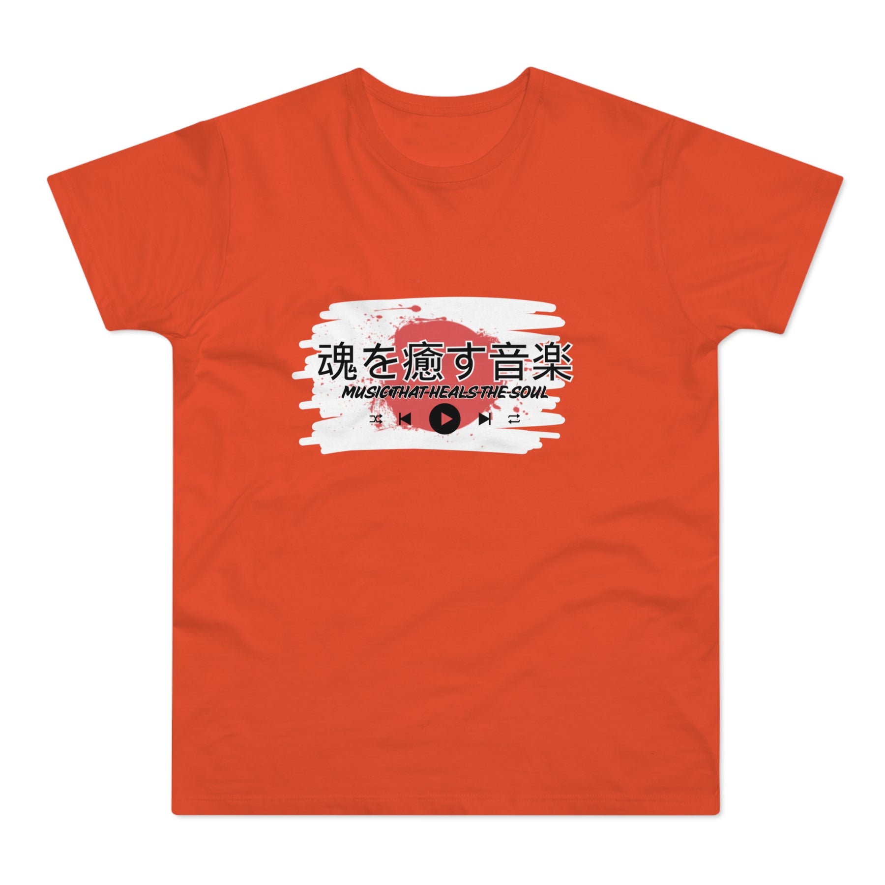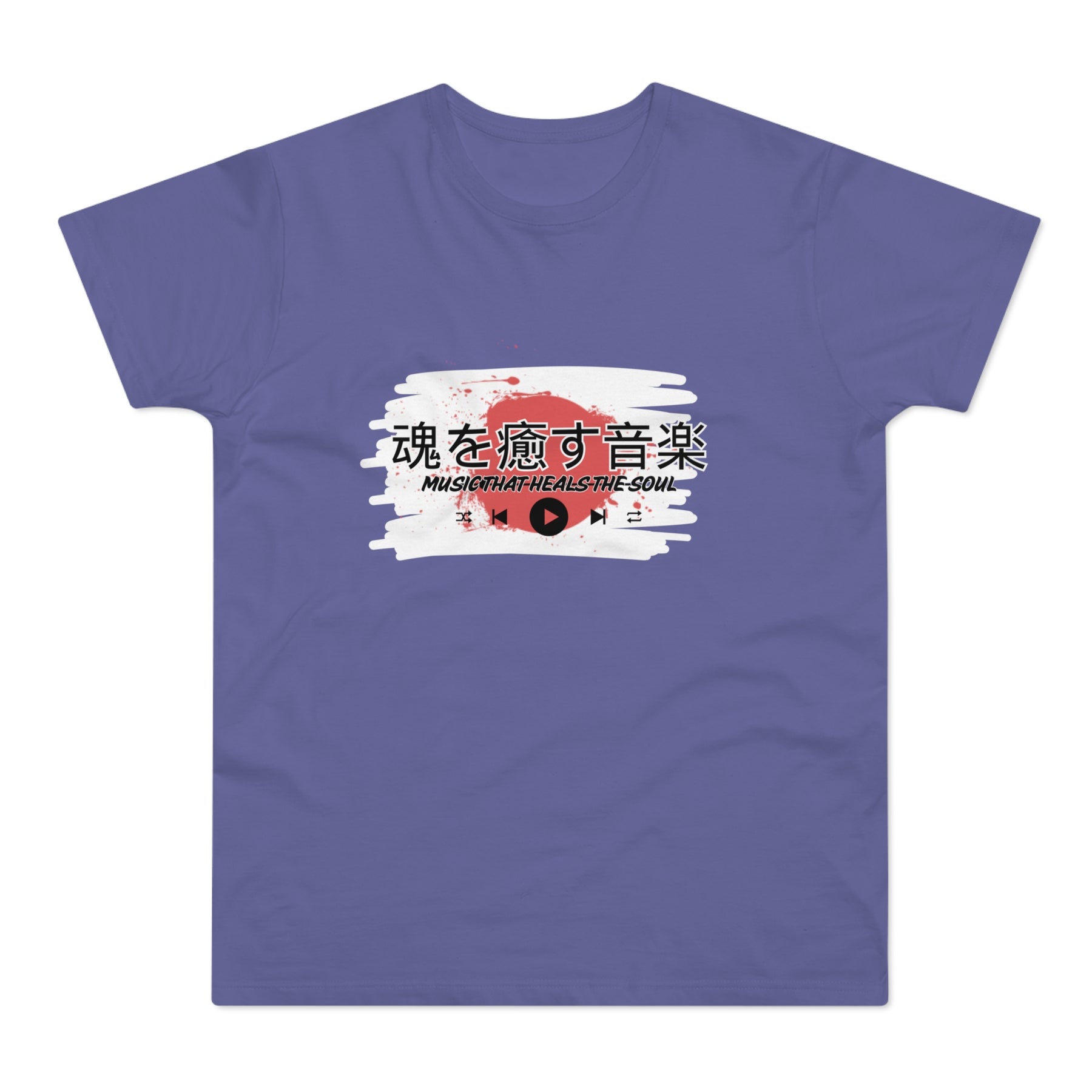Design: Japanese characters with the English phrase "Music that heals the soul"