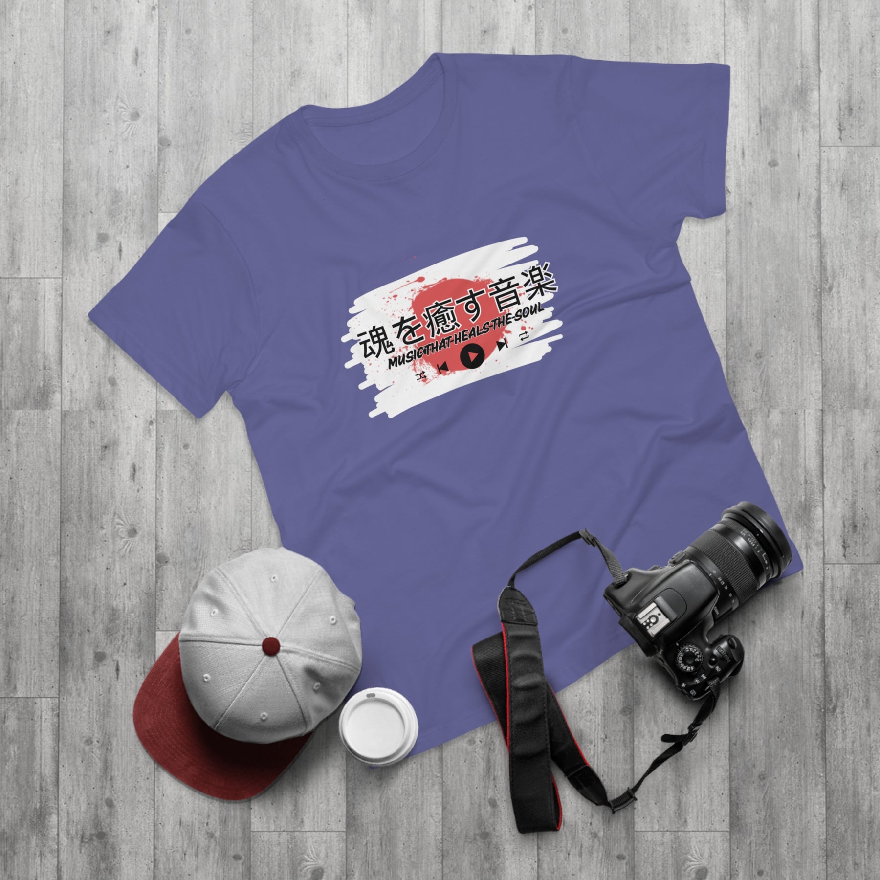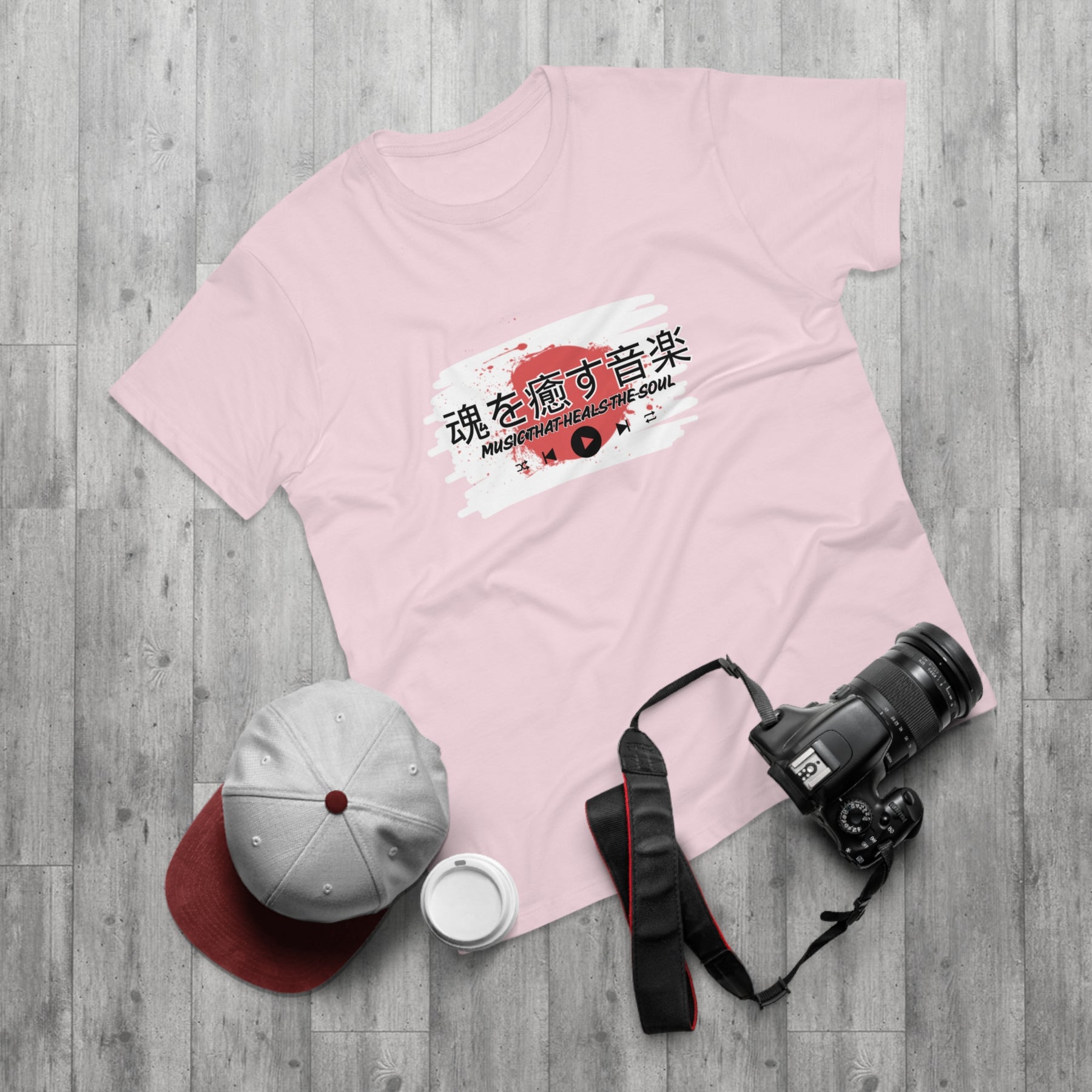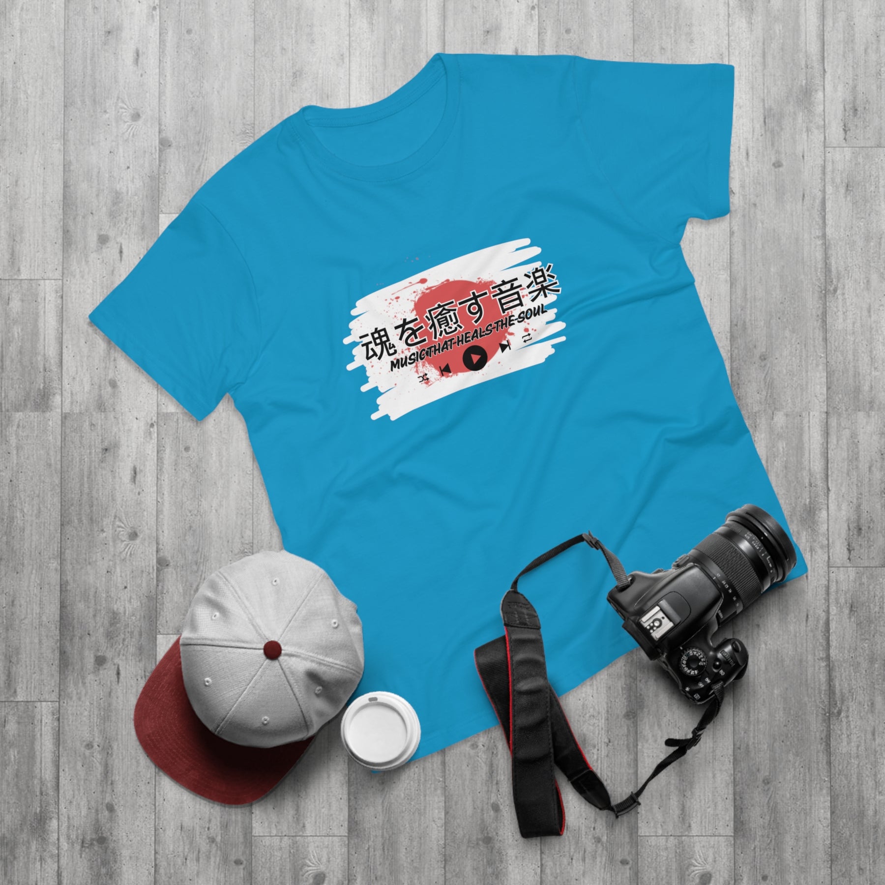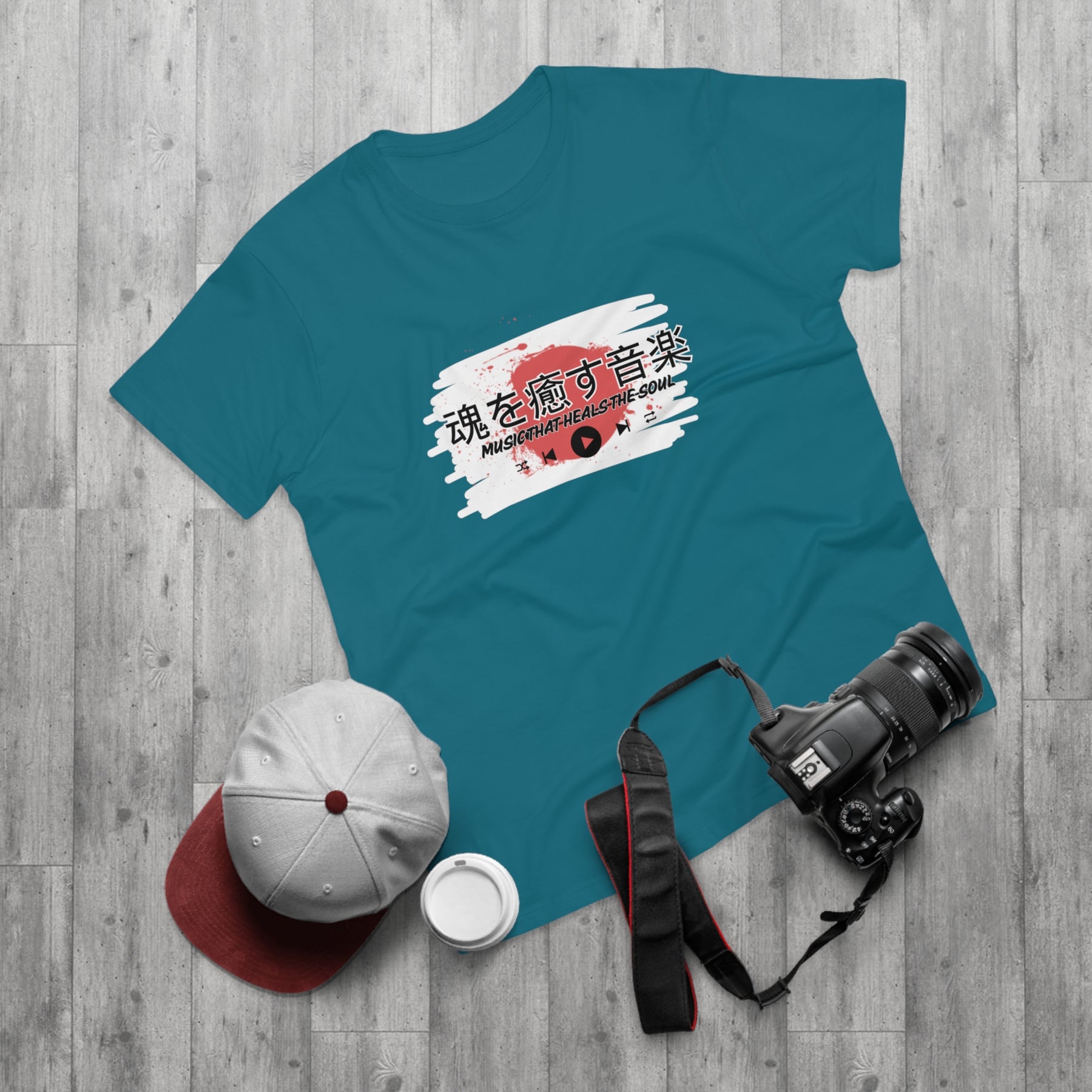 Design: Japanese characters with the English phrase "Music that heals the soul"