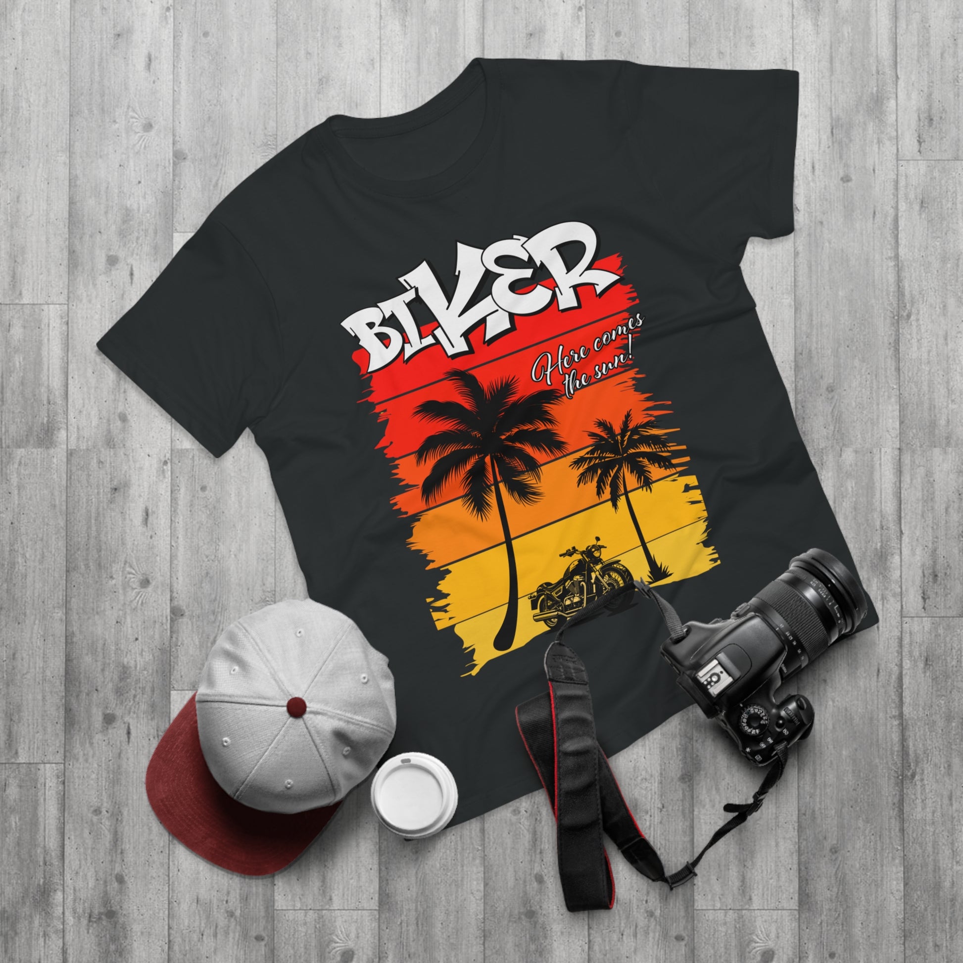 A dream come true for sun-loving riders! This design delivers pure easy-rider vibes â palm trees, sunset hues, a bold chopper and that retro color pop. With the phrase âHere comes the sun!â, itâs clear: this rider lives free and rides happy.