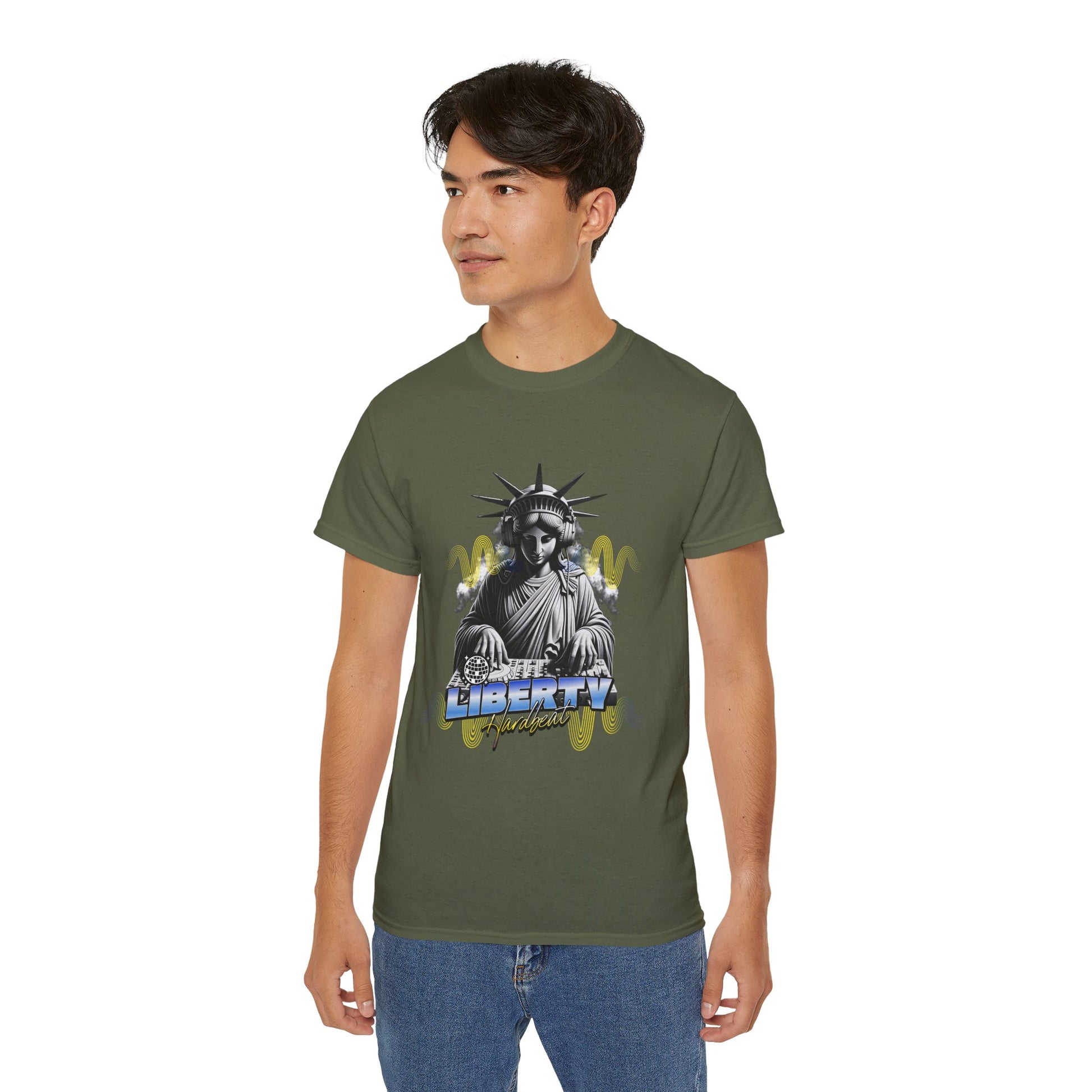 Lady Liberty reimagined as a DJ â rocking headphones and spinning tracks. This shirt makes a bold statement for those who see music as a form of freedom, power, and individuality. âLiberty Hardcoreâ represents your personal rhythm â loud, proud, and fearless.