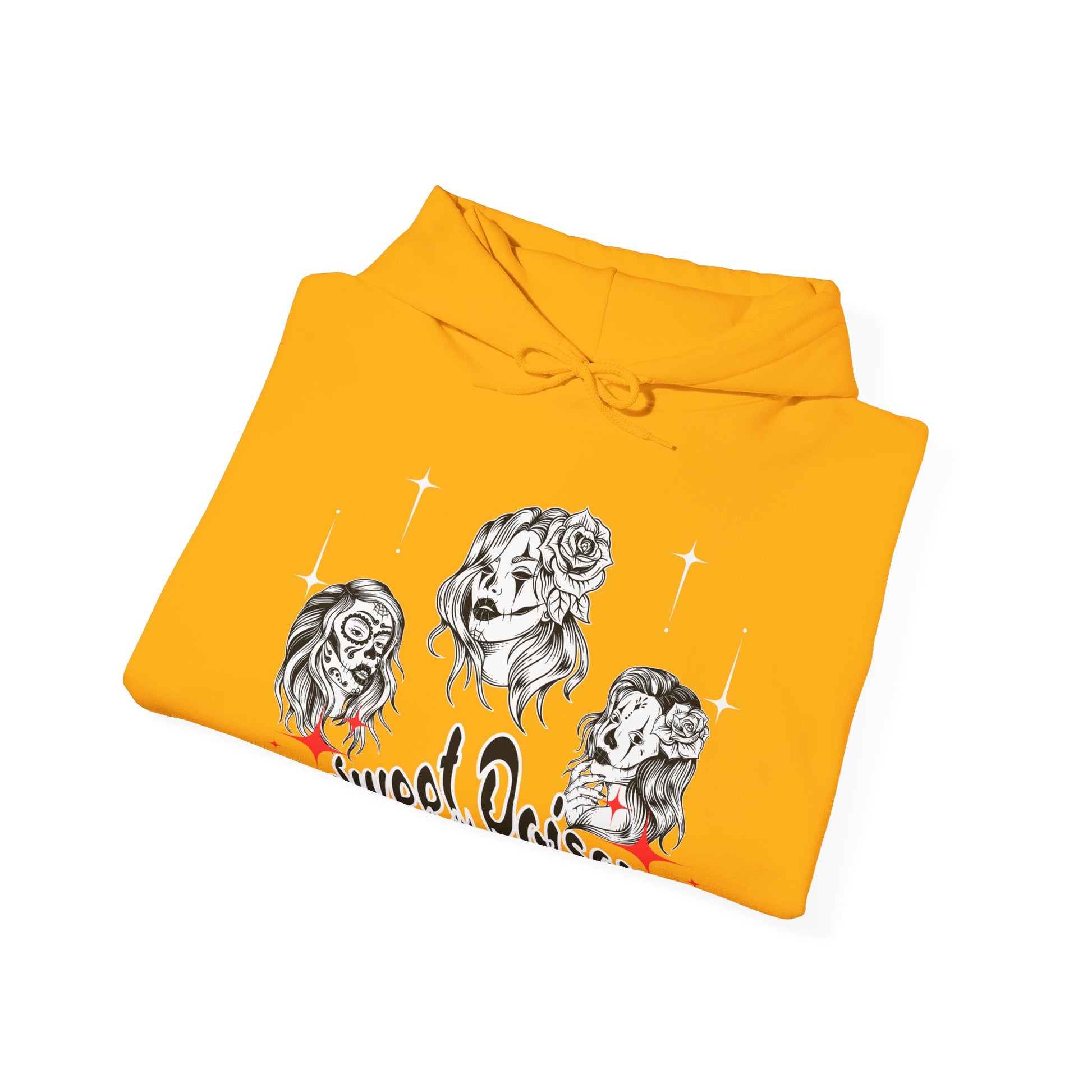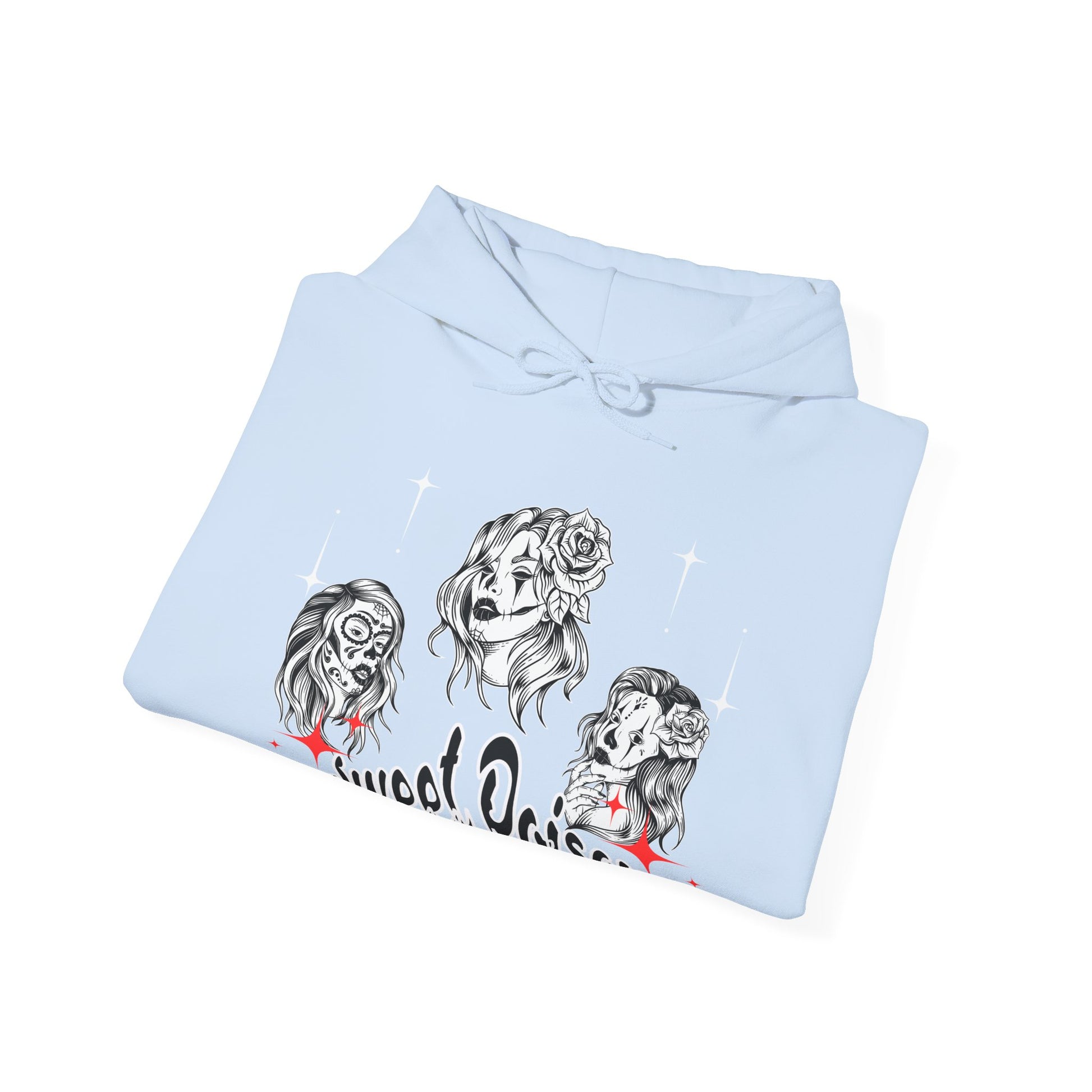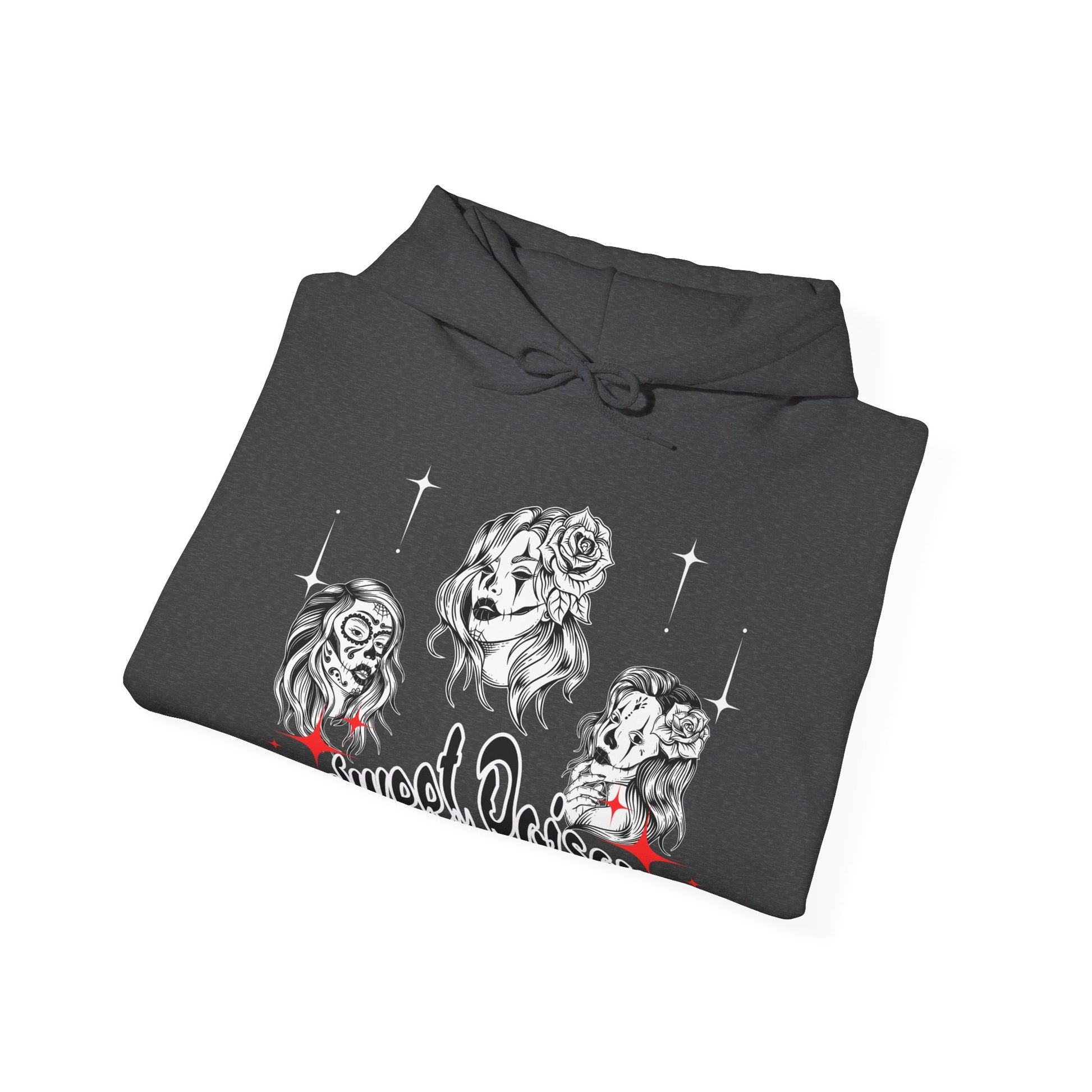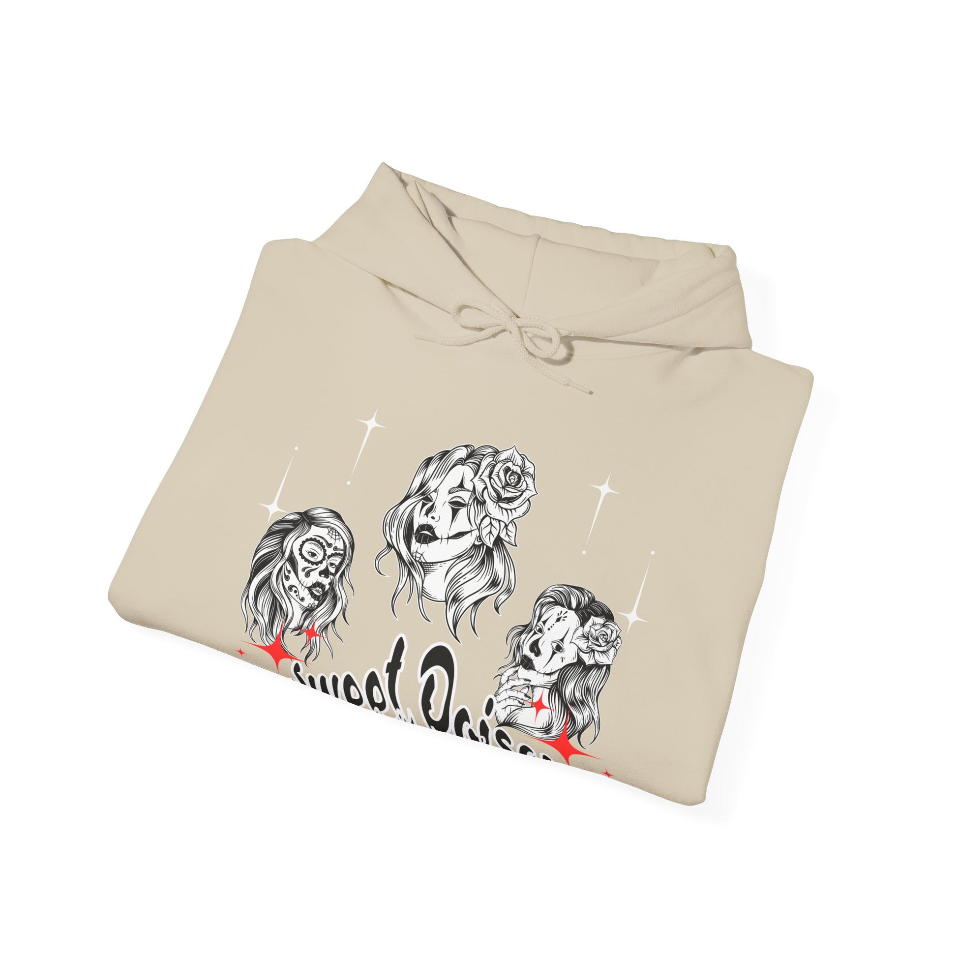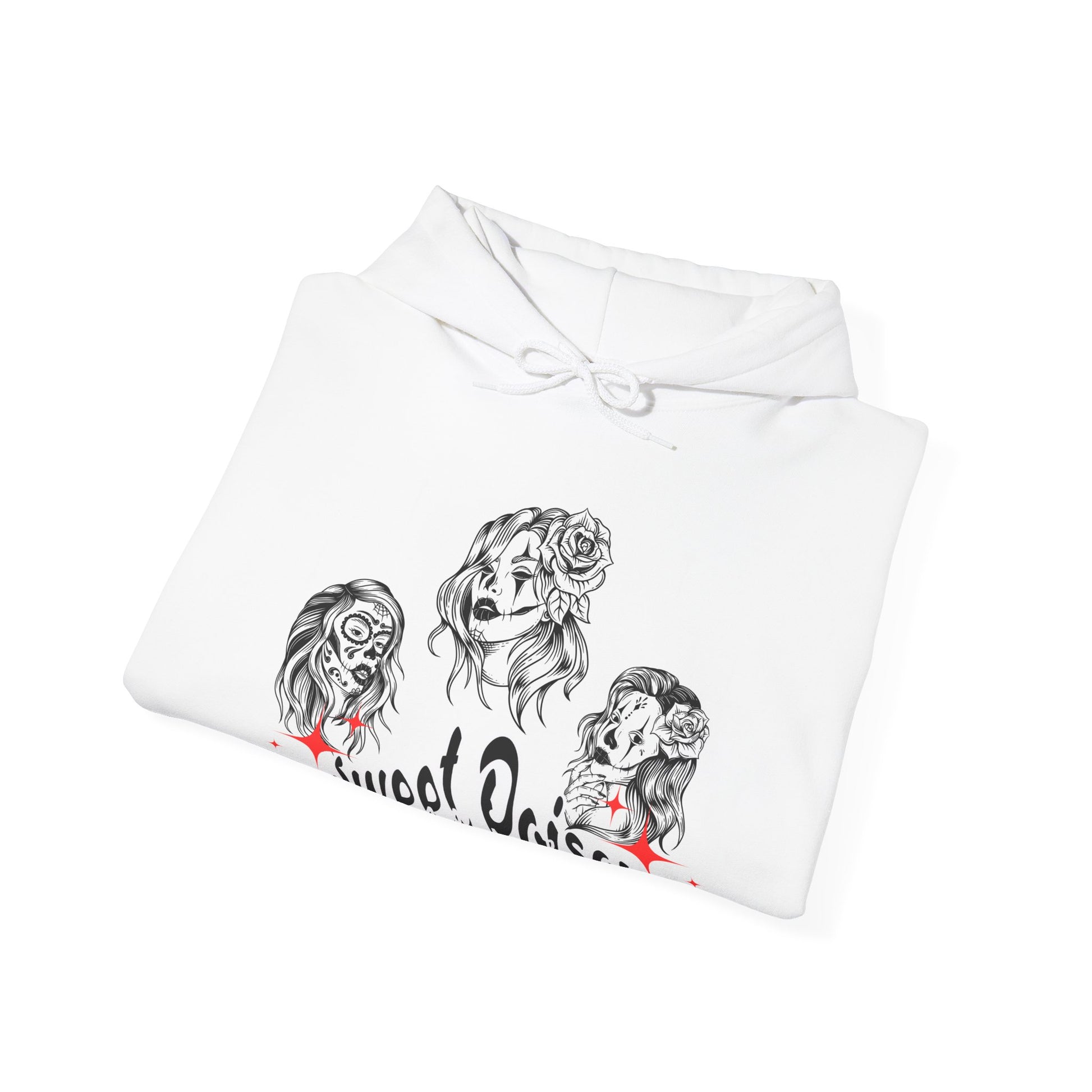 This hoodie pays tribute to fierce women with a dangerous charm â seductive, rebellious, and unapologetically stylish. The striking tattoo-inspired artwork features three captivating female portraits and the phrase Sweet Poison, making it the perfect piece for anyone who embraces both softness and edge.