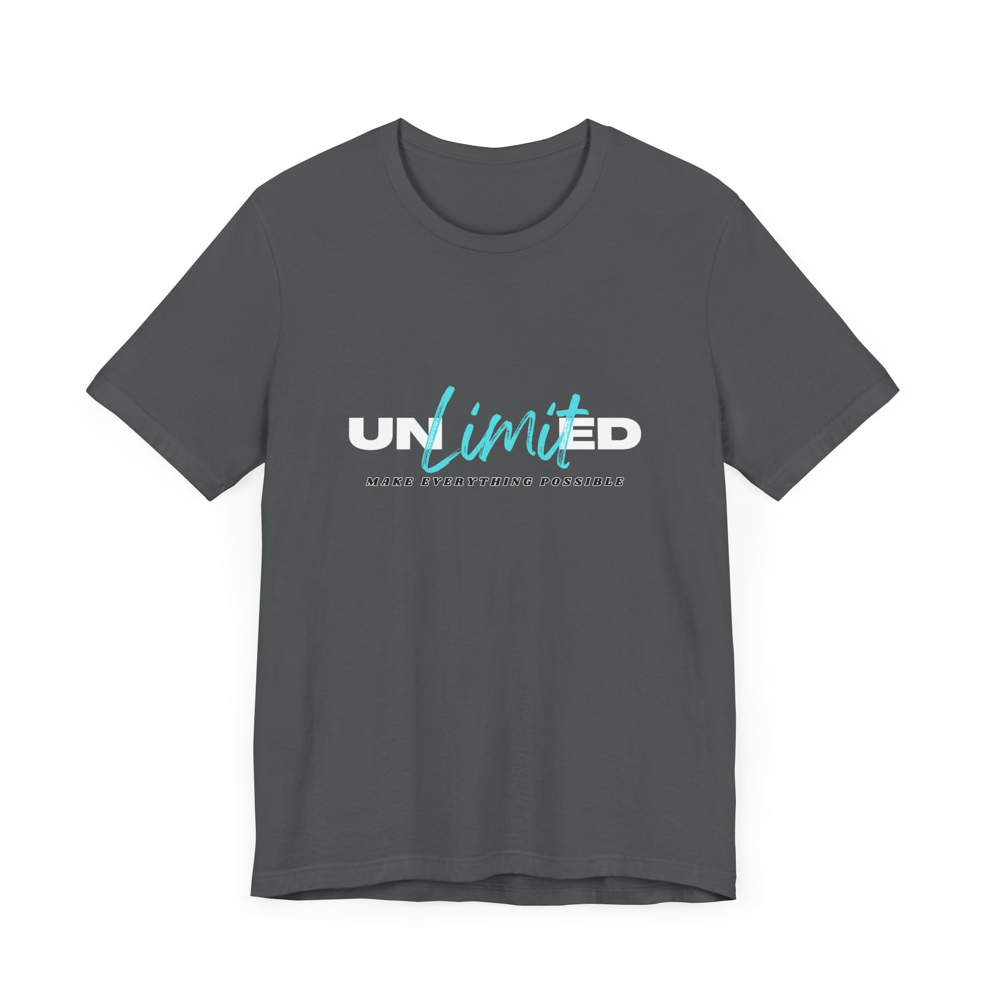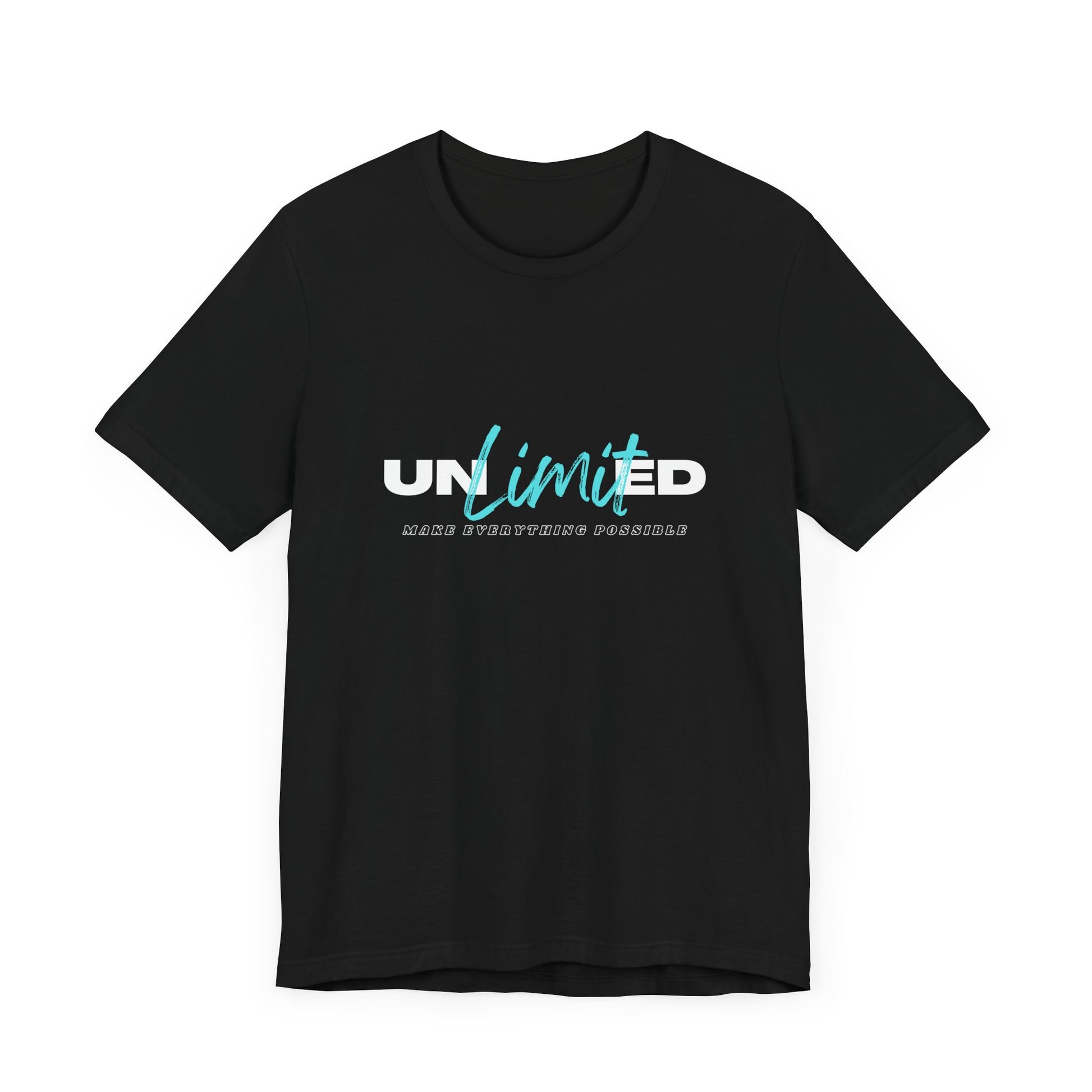 Minimalist front print: âunlimitedâ in bold type, âmake everything possibleâ in refined font
